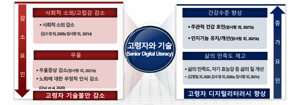 고령자의 기술 활용은 건강 수준 향상, 삶의 질 향상, 사회적 소외 및 우울의 감소 등이 나타나고 있음을 연구팀이 확인했다(Choi et al. 2020; 김명일외, 2020; 김수경외, 2020; 엄사랑외, 2021 등 다수의 실증연구). 특히, COVID-19 이후 다양한 서비스가 ICT를 활용한 비대면 서비스로 전환되어, ‘고령자의 디지털 리터러시가 높아진 효과가 있다’는 연구결과가 나왔다(경희대디지털뉴에이징연구소, 2022; SSK 고령자기술수용모델연구, 2023). 최근 경희대가 실시한 돌봄로봇(유연착용형, 커뮤니케이션, 인지재활로봇 등)에서도 고령자에게 긍정적인 효과를 갖고 있어 정신건강(우울감소), 사회건강(사회적지지, 사회적관계망)뿐 아니라 AgeTech 기술(제품) 이용에 대한 의향까지 증가되어 전반적으로 삶에 긍정적 영향을 끼치고 있음이 확인되었다.