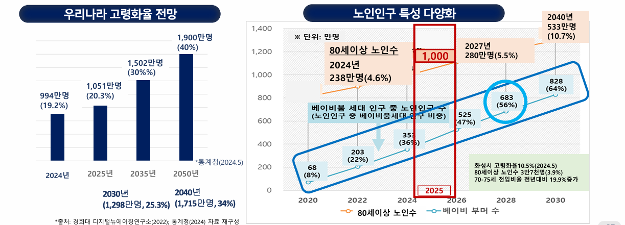 현재 베이비붐세대는 55년에서 63년생으로, 2020년부터 만 65세에 진입하여, 2028년 전체 노인의 56%로 확대될 것으로 보인다. 또한 75세가 되는 2030년에는 전체 노인 인구의 64%에 해당하며, 80세 후기 노인 인구수는 24년에 238만 명(전체 인구의 4.6%), 2030년에 307만 명(전체 인구의 6%), 2040년에 533만 명(10% 초과)으로 증가할 전망이다.
