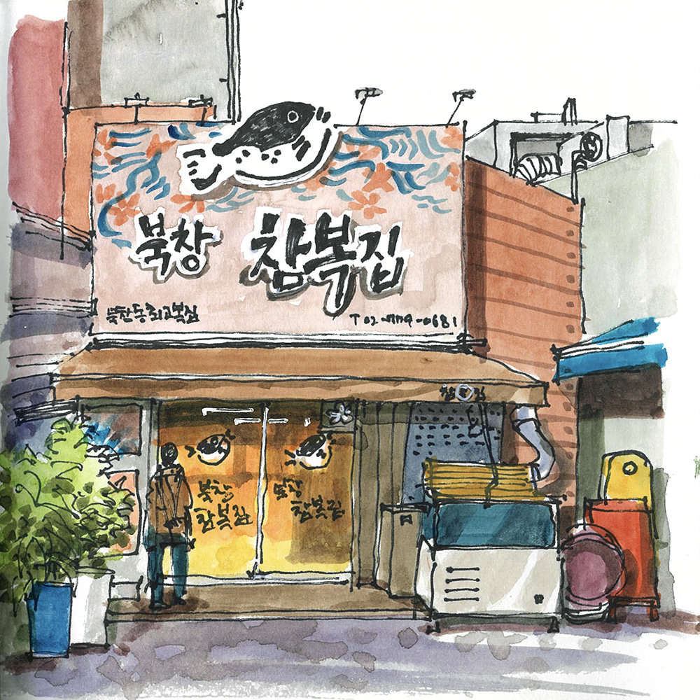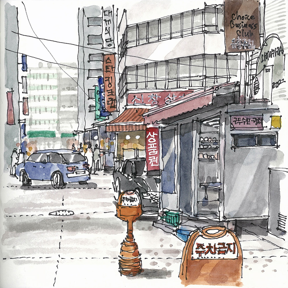 북창동 5년 전쯤 회사가 남대문 근처로 이사했다. 회사가 인접한 전면도로는 넓은 세종대로지만 이면도로인 북창동 골목길은 식당이 많아 직원들이 점심 식사 장소로 애용한다. 거의 매일 보는 풍경이라서 스케치의 분량도 상대적으로 많다. 사람과 주차, 식당 안내판들이 얽혀있는 이 좁은 골목길에는 한때 유흥주점이 많았지만 현재는 맛 집 골목으로 변신하고 있다. 40년, 50년을 넘는 오랜 역사를 자랑하는 원조집들은 물론, 유명 식당 체인점이 들어서고 비즈니스호텔까지 입점해서 외국관광객들에게도 인기가 많은 길이다. 저녁 시간에는 포차들도 등장하고 전문주점들은 영업준비를 서두른다. 업무를 마친 인근 회사원들은 삼삼오오 거리를 메우고 하루의 피로를 술잔에 담아 스트레스를 풀어 보낸다. 다양한 골목길은 보면 볼수록 스케치북에 담고 싶을 정도로 다이내믹한 강북 서울의 뒷골목 풍경을 그대로 노출하고 있다.