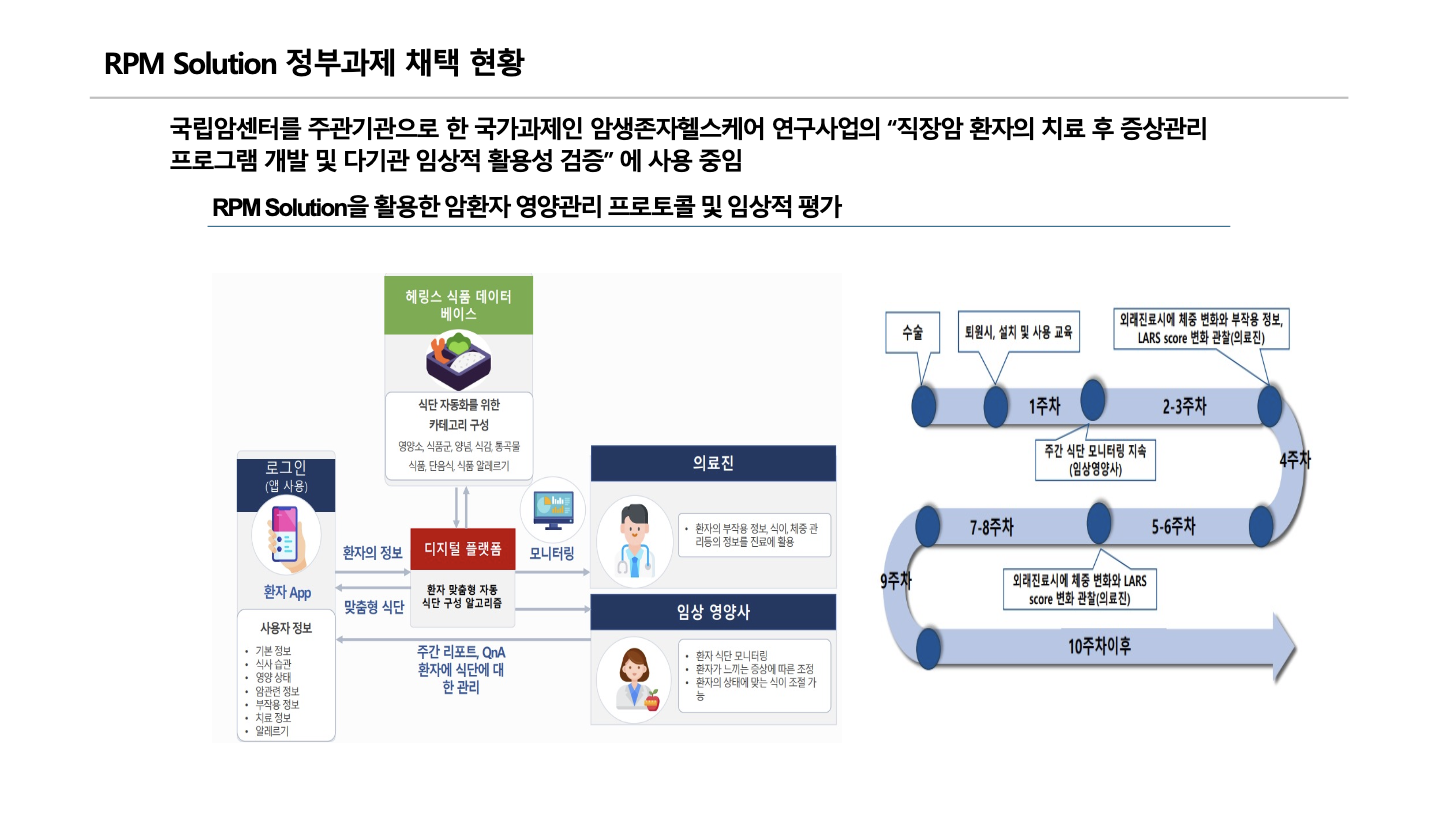 유니트 케어 시스템 세 번째 발표는 (주)헤링스의 남병호 대표가 ‘만성질환 환자들을 위한 원격모니터링 서비스’라는 제목으로 (주)헤링스가 암환자를 대상으로 서비스를 제공하고 있는 원격환자모니터링 서비스를 소개했다. 헤링스는 ‘힐리어리’라는 암환자 맞춤 영영 관리 플랫폼을 운영하고 있는데, 플랫폼을 통해서 의료체계에서 발생하는 분제를 분석하고 알고리즘화 하여 암 환자와 의료진, 임상영사 등 간의 원활한 커뮤니케이션을 돕고 있다. 최근 체성분 분석 회사인 인바디, 식품회사 등과의 B2B 협력에 나서고 있으며, 글로벌 측면에서는 룩셈부르크 정부와 협력하여 원격 환자 모니터링 시스템을 구축하여 시장 개척에 나서고 있다.