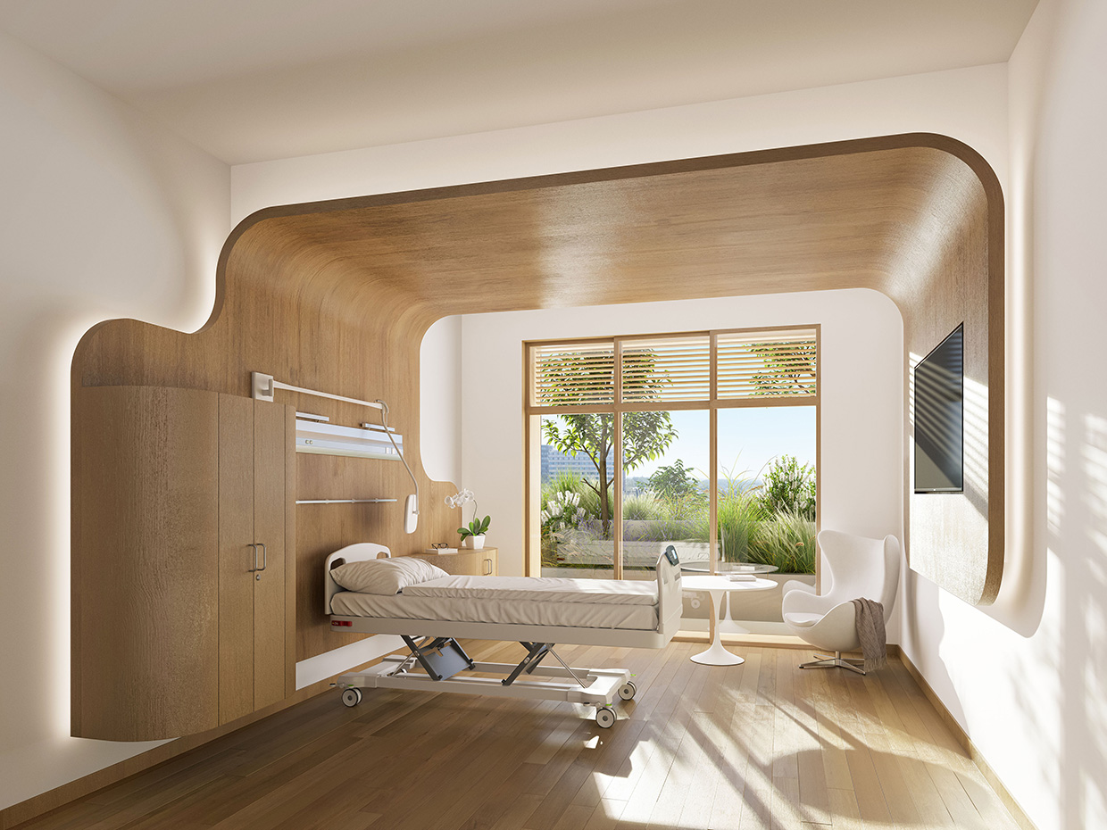 의료진을 위해서는 이 새로운 병원의 운영 성과를 높이기 위해 부서 간의 소통을 촉진하고자 투명하고 개방된 공간을 구조화하는 것을 의미한다. 이러한 공간들은 자연광이 들어오고 자연 환기가 가능하며, 생물 기반 재료, 재활용 및 재사용 가능한 자재로 건축된다.