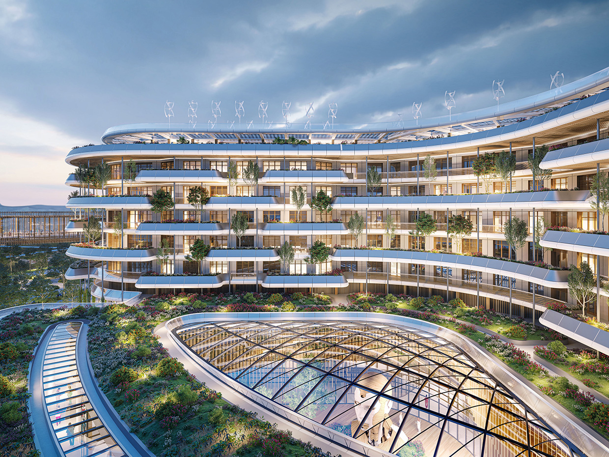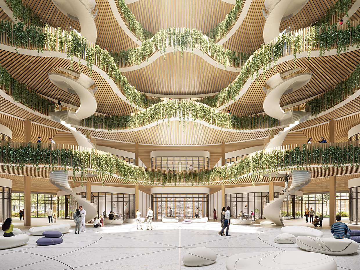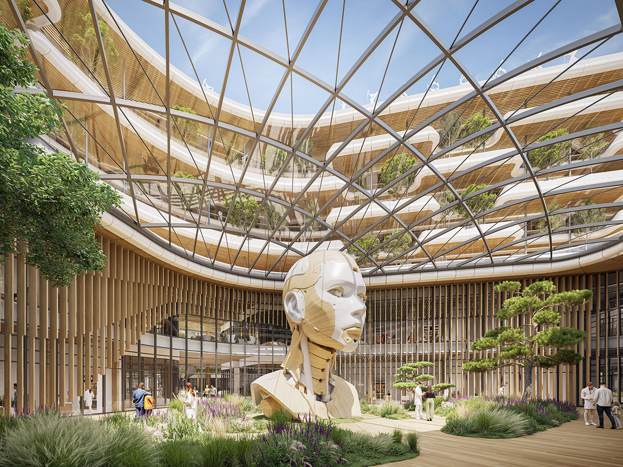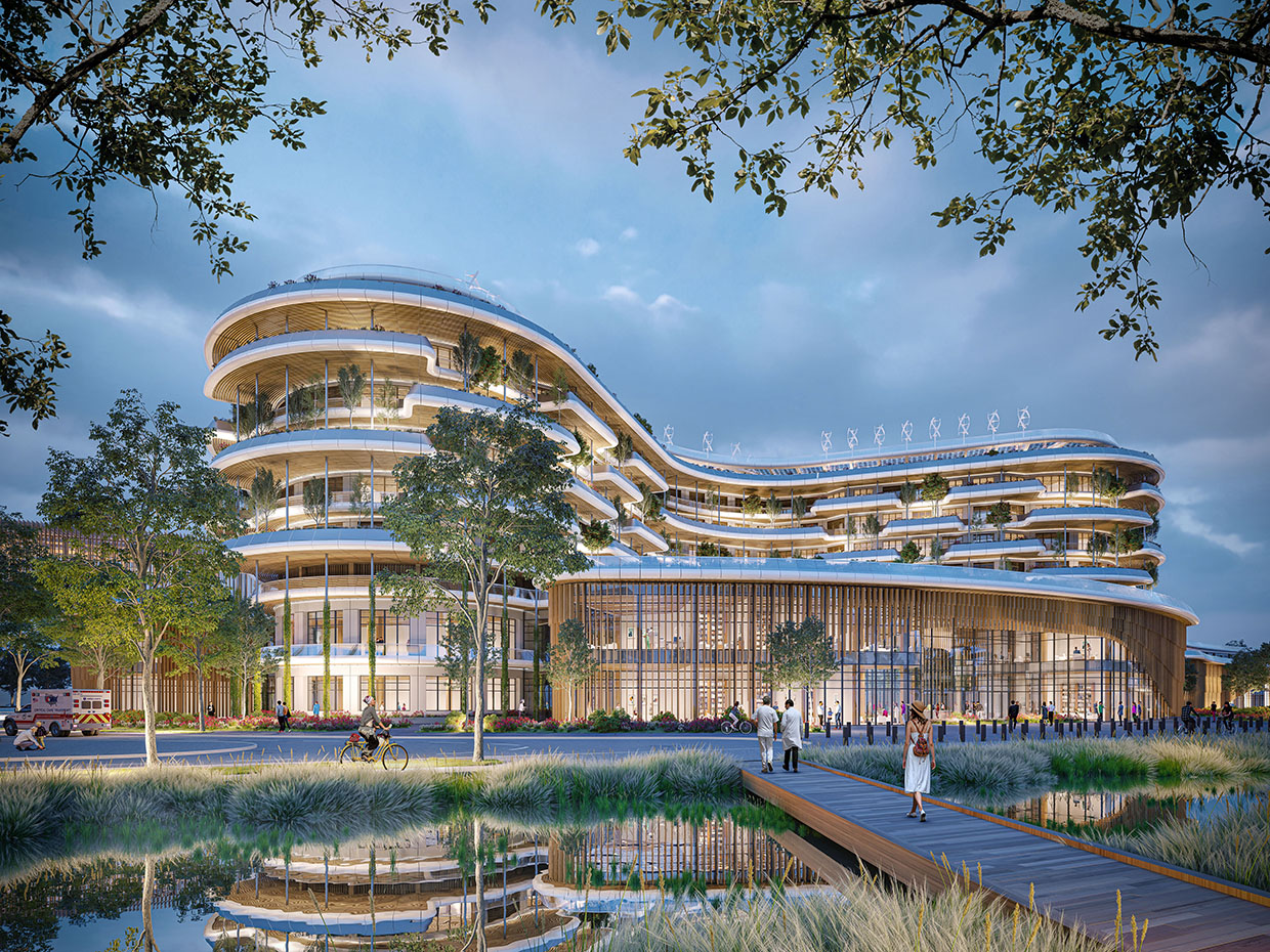 - 더 버티칼 포레스트(The Vertical Forest): 새로운 롱탱 병원 캠퍼스는, 66,500m²의 프로그램에 걸쳐 600개의 병실이 분포하는 ‘중간 높이’ 건물이다. L+6층으로 구성된 이 건물은 부드러운 곡선과 거의 모성적인 형태를 가진 건축으로, 자연친화적 분위기 속에서 치료받을 수 있는 진정한 수직 숲을 형성한다. 원형 기초는 지상층과 L+1층에서 기술 플랫폼을 대형 파티오, 아트리움, 정원 주변으로 집약된 컴팩트한 설계를 보여준다.