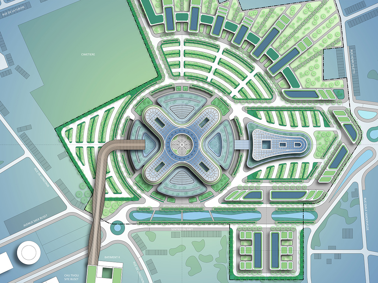 서쪽에서 동쪽으로는, 라 플라슈 거리(rue de la Flache)에서 에비뉴 맥스 부세(avenue Max Buset)거리까지 병원, 정원, 상점, 그리고 높이 35미터의 멋진 아트리움을 가로지르는 공공 경로가 제공된다.
