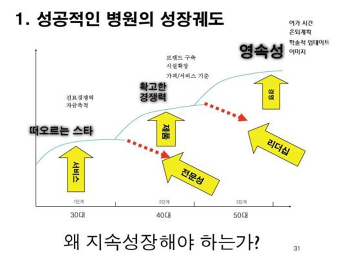 1차 의료기관이던지 2차 3차 병원이던지 병원이 성장하는 것은 곡선이 있고 그 시점마다 필요한 것이 달라진다. 원장이 나이를 먹어가면서 부터 30대에 필요한 것과 40대에 필요한 것 50대에 필요한 덕목이 달라진다. 서비스-제품-경영으로 승부를 걸어야 하고 그것이 잘 이루어 질려면 전문성이 필요한 시기와 리더십 그 후의 철학적인 뒷받침까지 있어야 적어도 영속적인 병원까지는 아니더라도 자기가 은퇴하기 전까지 병원을 운영할 수 있는 것이다.
