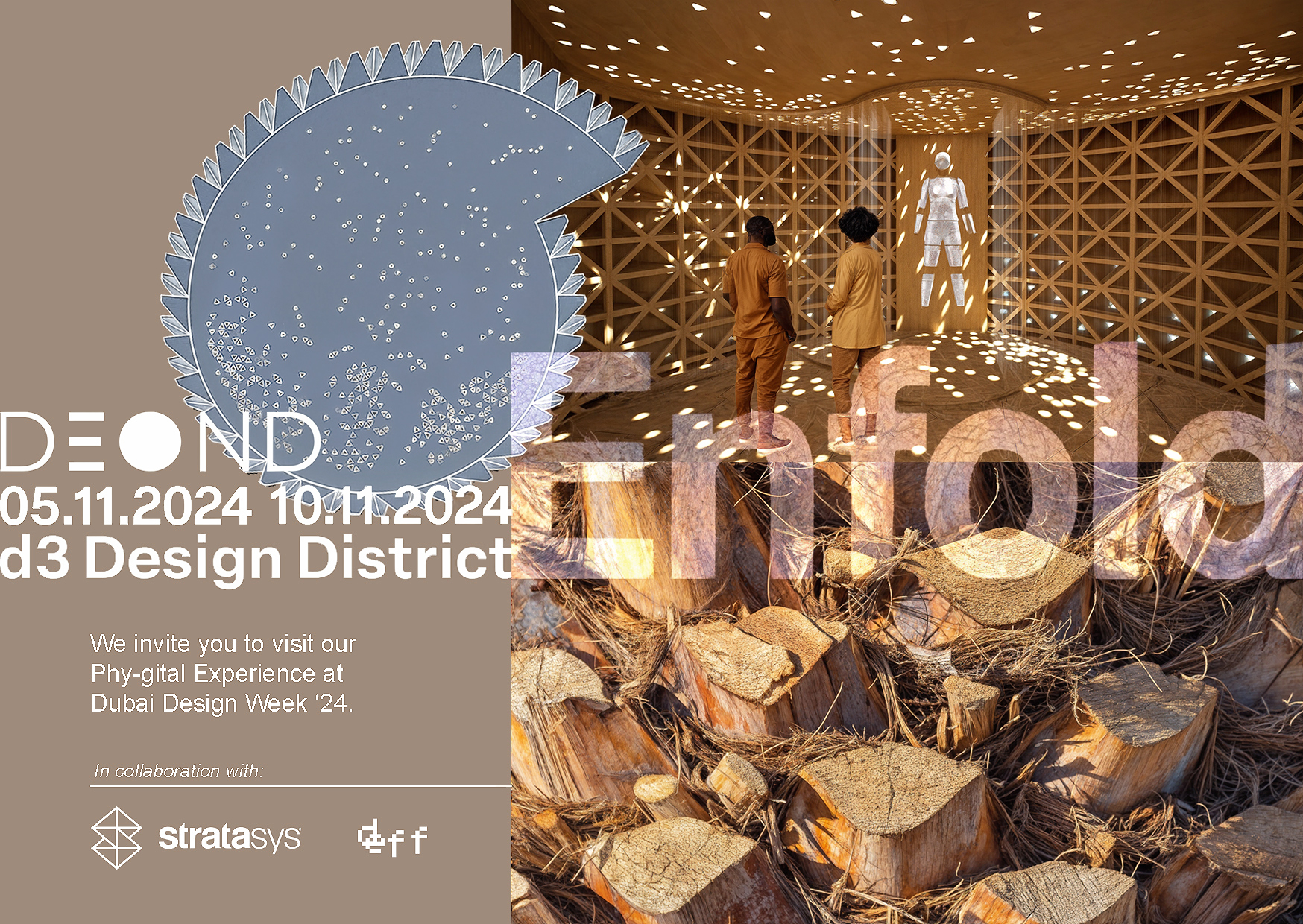 DEOND SAVE THE DATE invite-horizontal 이번 프로젝트는 기술이 인간의 신체 회복 능력에 도움을 주도록 설계된 엔폴드(Enfold)’ 파빌리온으로, 인간과 기술의 온전한 결합이라고 말할 수 있다. 특히 이번 두바이 디자인 전시에 공개될 두 개의 작품은, 지속가능한 재료를 통해 인간의 몸과 마음, 기술을 모두 포용한 설치물과 피부를 통해 인간의 마음과 감정을 조절하는 바디수트다. 이는 모두 피지탈 치료 개념으로 탄생된 결과물이며, 신체와 기술을 통합하는 전체론적 포용을 상징한다. 이러한 시스템이 개발된다면, 앞으로 기술을 통한 인간의 전인치료가 가능해질 것으로 기대된다.