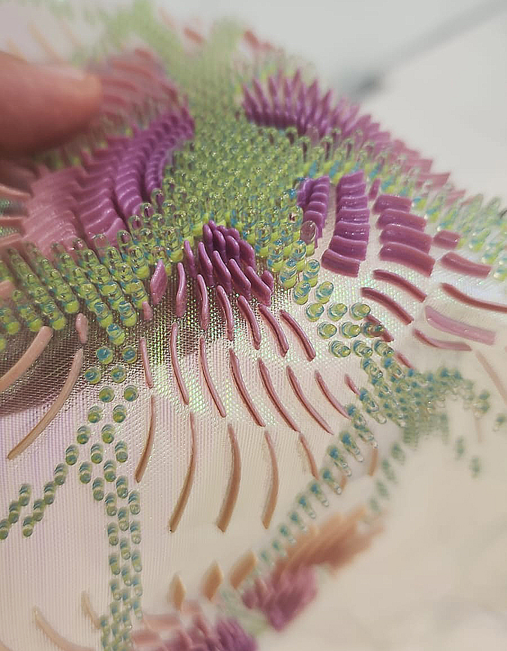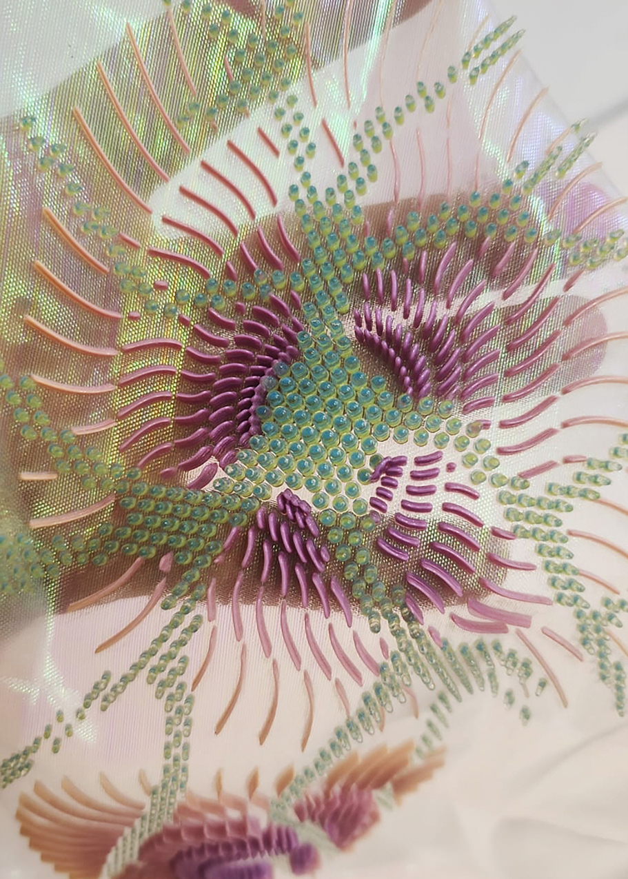 DEOND_HUG Holistic Unified Garment ©Ila Colombo & Deff Collective 동양의 치료 방법론과 서양의 과학 및 기술 접근 방식을 융합한 HUG(Holistic Unified Garment) 바디수트는, 불안을 치료하고 마음과 몸의 속도를 늦추는 데 도움이 될 수 있도록 새로운 형태의 추상적 도구를 구상한다. 인공지능(AI)과 3D 디자인 도구를 사용한 이 의류는 자연의 형태를 모방하고 몸의 몇몇 지점을 자극한다. DEOND는 “기계로서의 신체/정원으로서의 신체”라는 이중성이 해소된다면, 인간과 전체 생태계가 어떤 혜택을 받을 수 있을지를 연구한다.