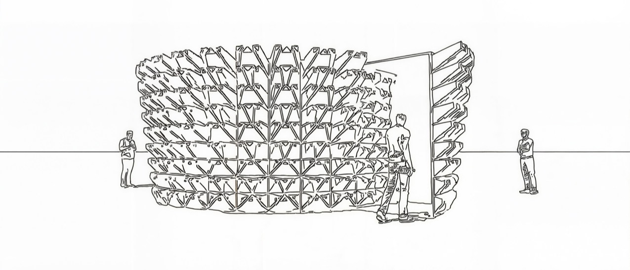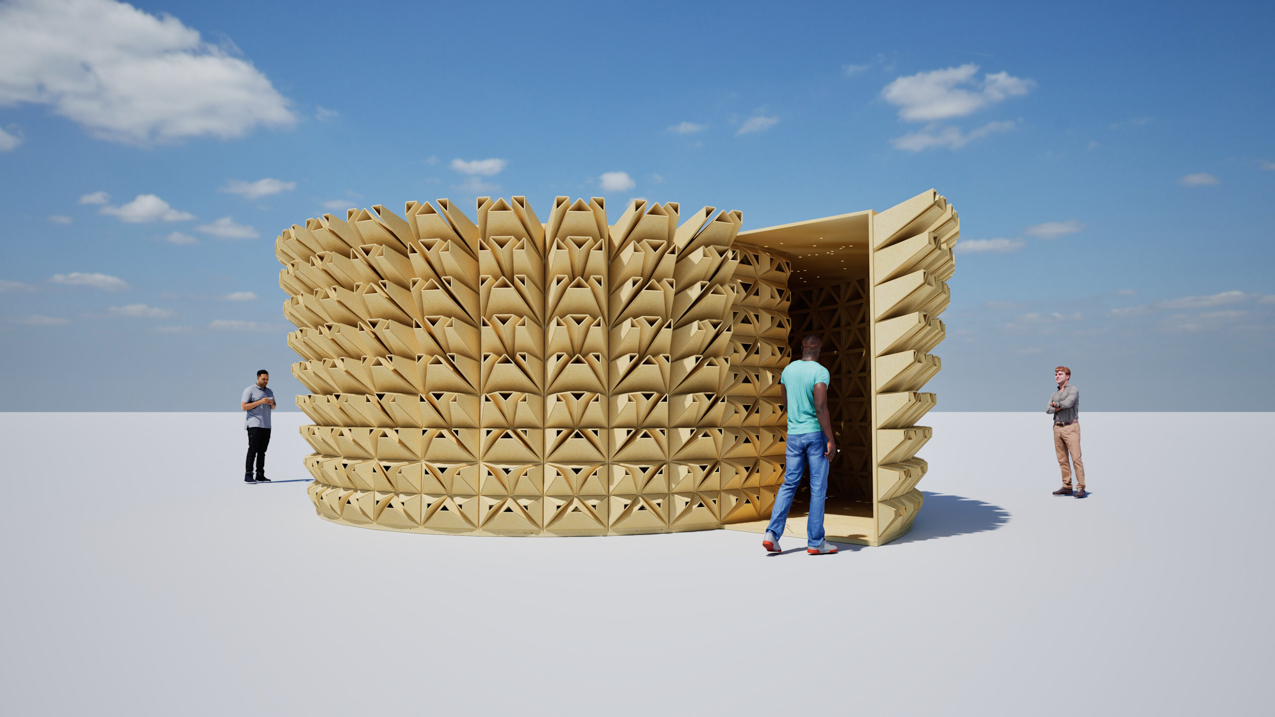 DEOND_Enfold pavilion_digital outline drawing ©DEOND 이 설치물은 디자인에서 생체 모방을 구현하고 있으며, 외부는 자연의 거칠고 뾰족한 씨앗을 참조하고, 내부는 편안하고 재생 가능한 핵심을 담고 있다. 기하학적인 원형 디자인은 연속적인 폐쇄감을 만들어내며, 이는 몸, 마음, 기술을 통합하는 전체론적 포옹을 상징한다. 밀도와 크기가 다양한 천공 지붕은 부드럽고 자연스러운 빛이 공간으로 스며들어, 태양의 경로에 따라 강도가 변화한다. 전체 구조와 마감은 지속 가능성에 대한 전시의 약속에 맞춰 골판지로 제작되었다.