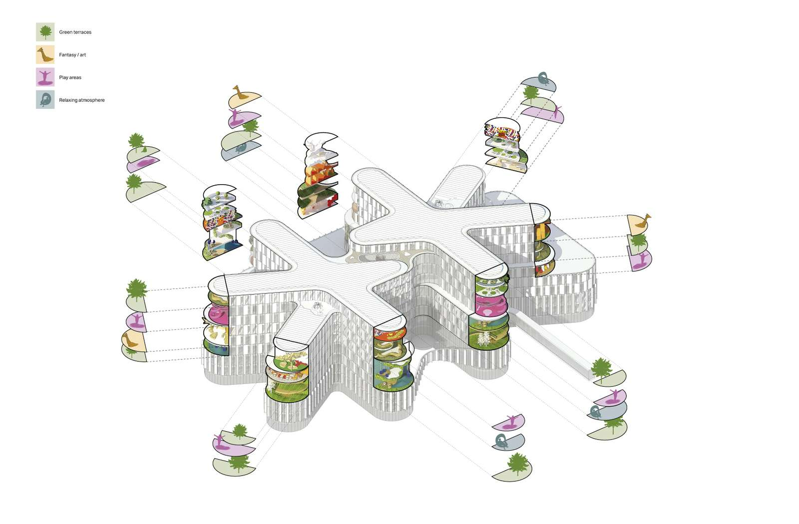 두 손가락 모양의 건물로 놀이와 치유 환경이 조화롭게 조성되다!