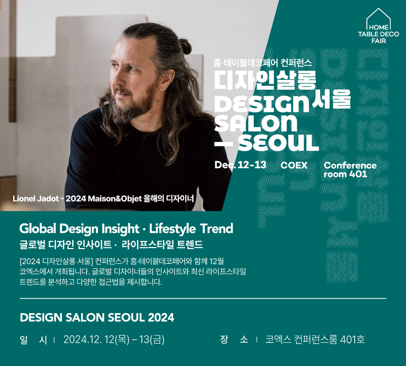 세계 3대 인테리어 전시인 프랑스 파리 메종오브제(Maison&Objet)의 주최사 리드엑시비션스(Reed Exhibitions)가 주최하는 디자인 컨퍼런스 ‘디자인살롱 서울 2024’가 오는 12월 12일과 13일 양일간 서울 삼성동 코엑스(COEX)에서 개최된다. 이번 ‘디자인살롱 서울 2024(이하, 디자인살롱 서울)’는 ‘글로벌 디자인 인사이트 · 라이프스타일 트렌드’를 주제로 최신 라이프스타일 트렌드를 다양한 시각으로 접할 기회를 제공한다. 이번 컨퍼런스는 오는 11월 15일까지 얼리버드 할인가로 티켓 구매가 가능하다.