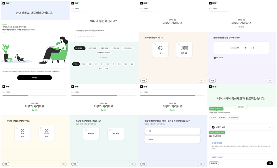 네이버케어 공식 홈페이지: 서비스 사용 과정 예시 이미지 네이버가 지난 9월 AI를 활용한 디지털 헬스케어 서비스 ‘네이버케어’의 베타 서비스를 시작했습니다. 주요 기능은 증상 입력 시 예상 병명과 가까운 병원을 안내하는 온라인 증상체크 서비스로, 홈페이지나 앱을 통해 네이버케어를 입력하여 이용 가능합니다. 서비스 과정에서는 성별, 연령, 증상 정보를 입력해 세밀한 진단 결과를 제공하며, 네이버 지식백과와 지도를 활용해 상세 안내를 지원합니다. 이에 더해, 추천된 의료기관을 선택하면 네이버 예약으로도 연결이 가능합니다.