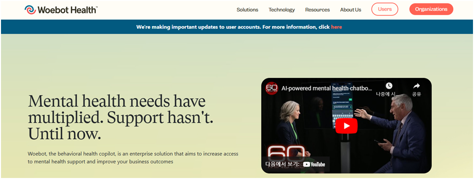 AI 챗봇은사람들이 겪는 감정을 이해하고 스트레스에 공감하며문제를 관리하는 데 도움을 줍니다. 인지 행동 치료(CBT) 기법을 활용하여 사용자가 자신의 감정을 분석하고, 긍정적인 사고로 전환할 수 있도록 합니다. 사용자는 언제 어디서나 AI챗봇에 접근할 수 있고 필요할 때 즉각적인 지원을 받을 수 있습니다. 이러한 접근성은 특히 바쁜 현대인들에게 큰 장점으로 작용합니다. Woebot은 사용자의 대화 내용을 분석하여, 그들의 감정 상태를 파악하고, 문제 상황에 적절한 조언을 제공합니다. 이로 인해 사용자는 자신의 감정을 더 잘 이해하고, 스트레스를 효과적으로 관리할 수 있습니다.