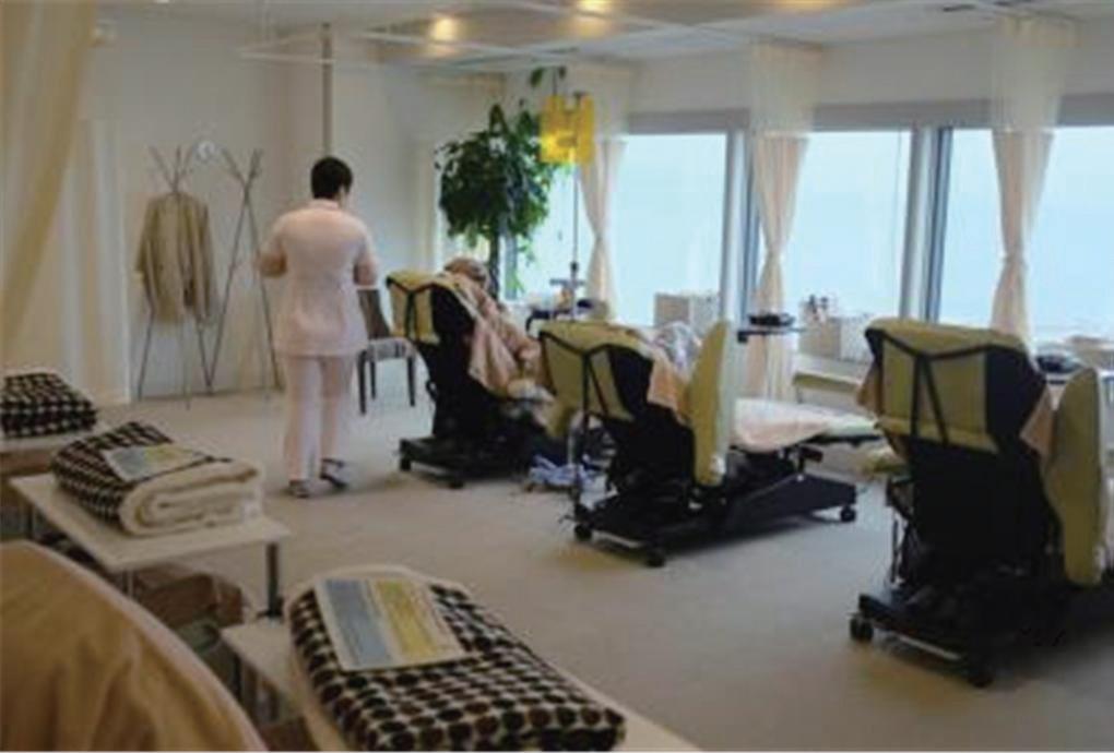 오사카만 뷰의 말기암 환자 수액치료실. (출처: IGT 클리닉 방문 촬영, 김재욱) 그가 죽기 직전까지 누렸을 삶의 질은 매우 큰 차이가 있었음은 당연 하다. 이곳에서는 동맥색전술 외에도 수액 요법과 온열 치료 등을 시행 하면서 말기 암 환자들의 증상 완화를 위해 노력하고 있다.
