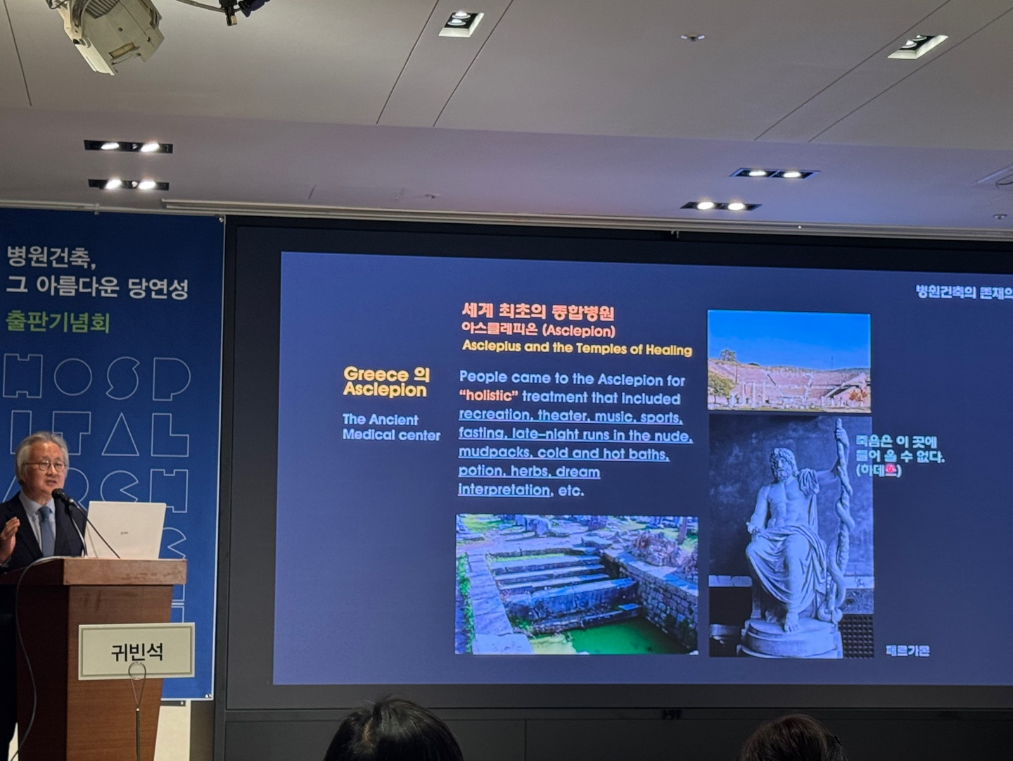 그는 인문학적인 관점에서 병원건축을 바라보며, 그리스 시대 최초의 종합병원인 아스클레피온부터 현재의 병원건축까지의 전과정을 재미있게 풀어냈다. 특히 병원건축에 존재해야 될 가장 중요한 의미는 기능이 아니라 ‘치유와 돌봄’이라고 강조하면서, 많은 사람들이 스마트 시티를 얘기하고 있지만, 노인들이 증가하고 있는 우리 시대 ‘돌봄을 위한 도시’라는 개념들이 현대 도시와 건축에서 회복되어야 한다고 주장했다. 이와 함께 체계 중심 병원의 중요성을 언급하며, 현재 병원 리모델링을 진행하는 데 있어 기능과 용도를 자유자재로 바꿀 수 있다는 점에서 큰 강점을 가진다고 설명했다.