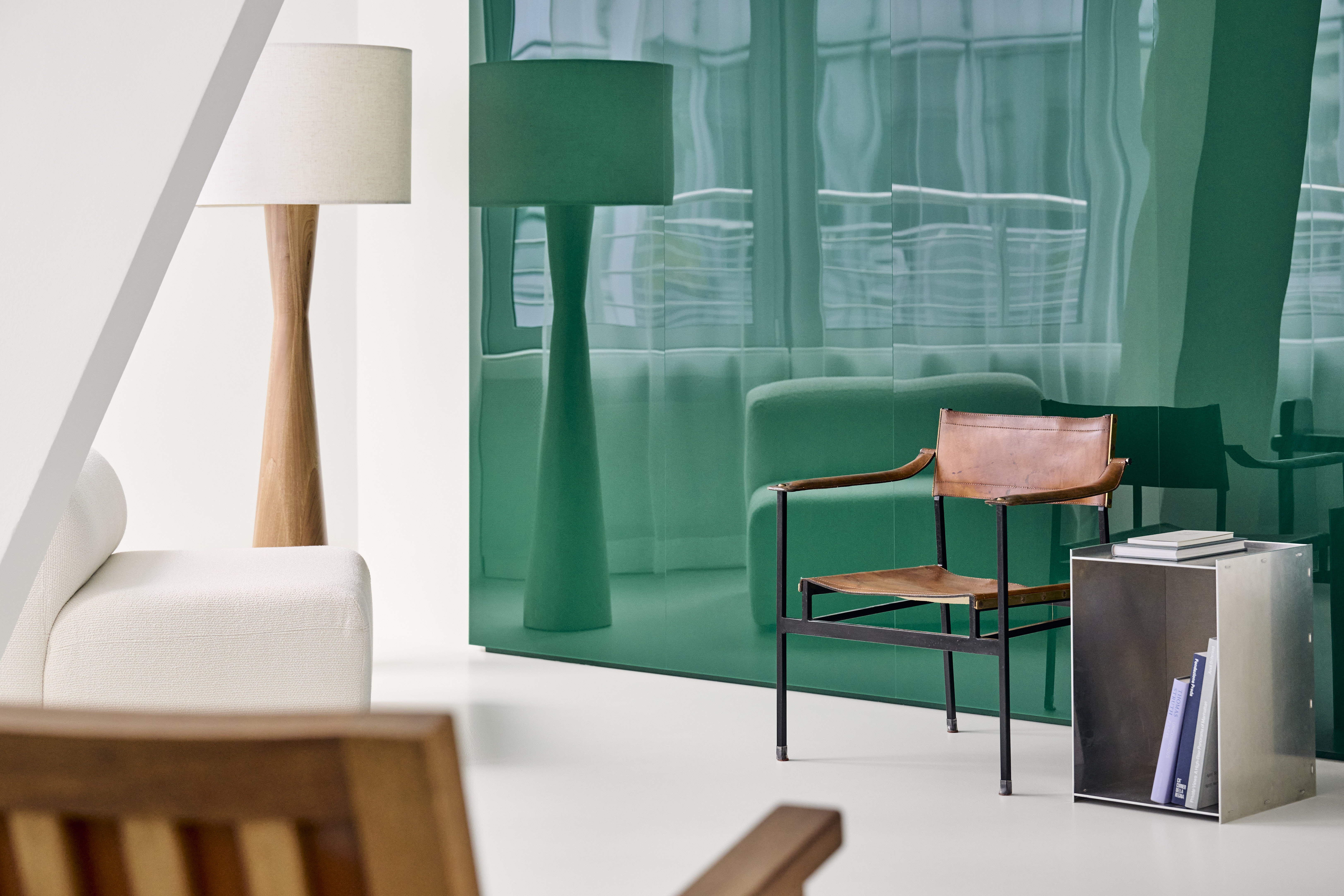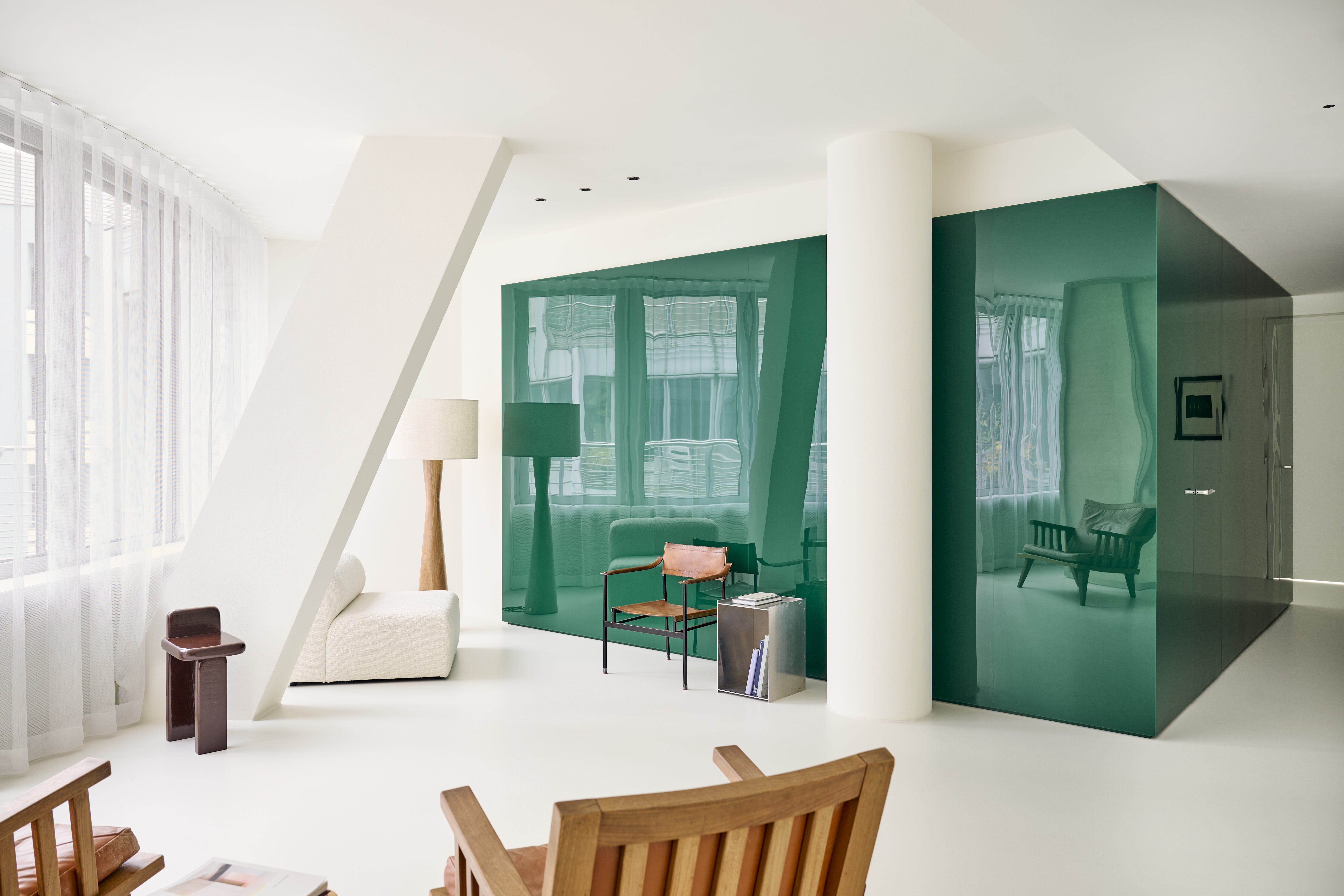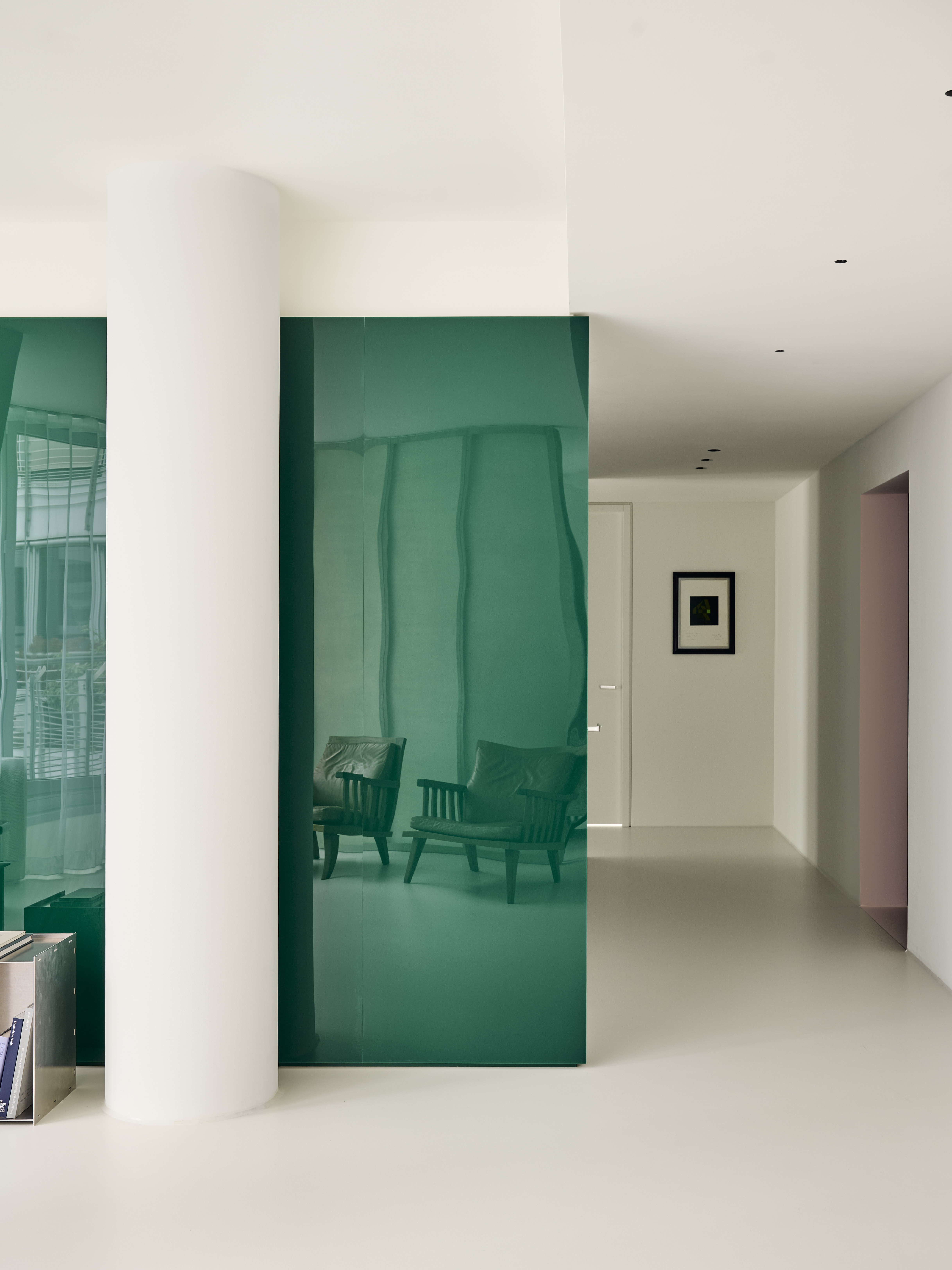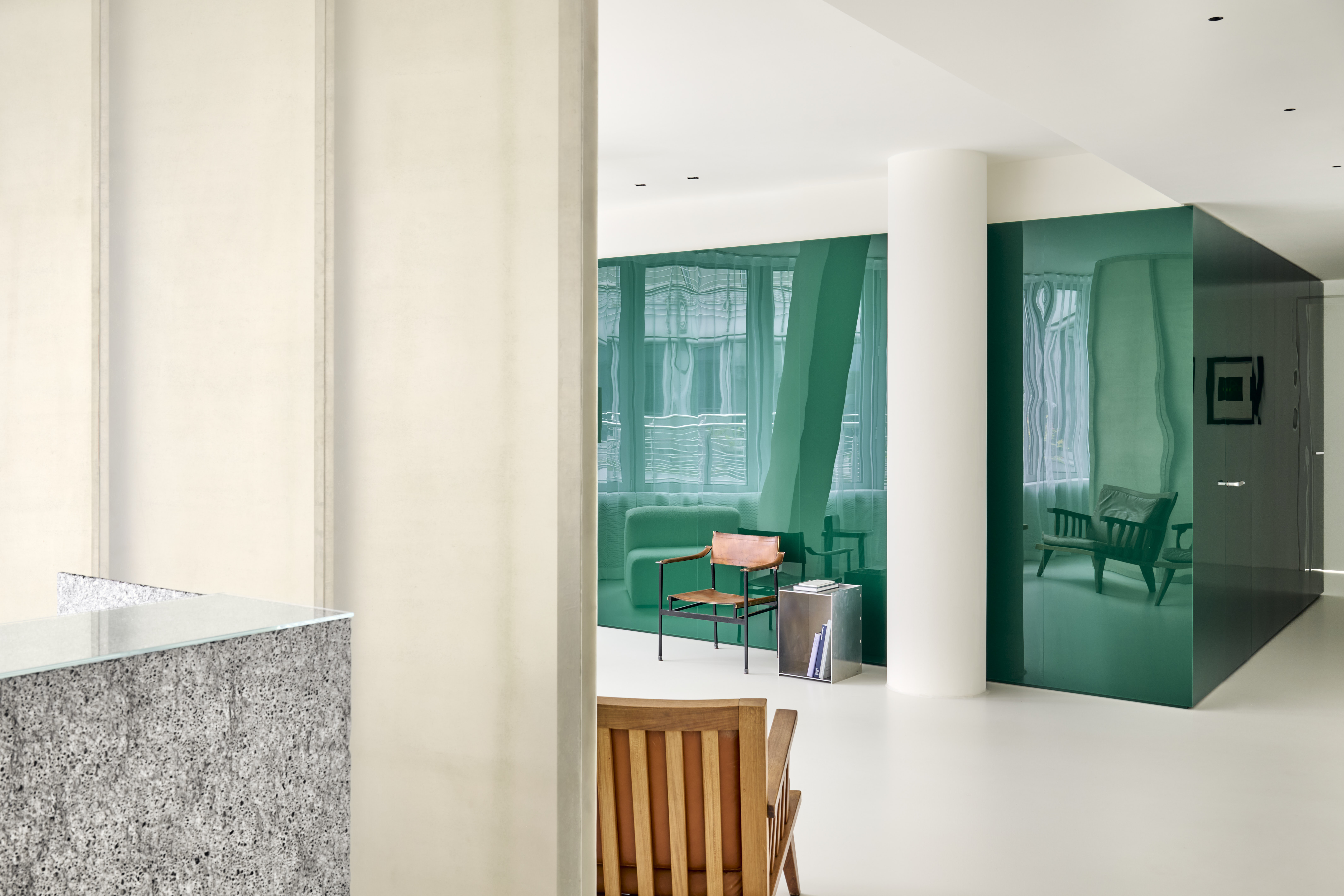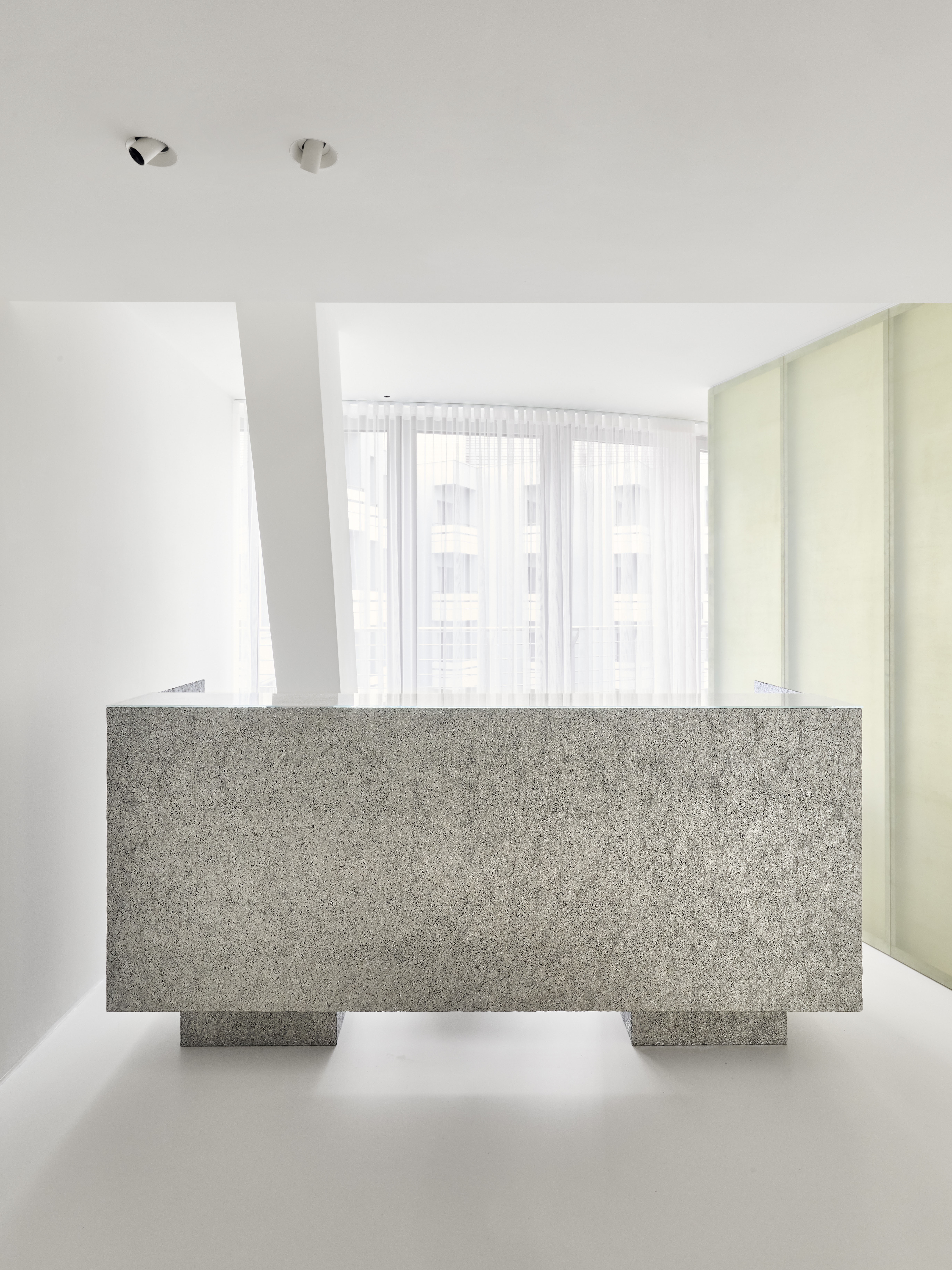 BATEK_T7.2_Daniel_Schäfer_001 내부는 바닥에서 천장까지 녹색 아크릴 유리로 덮인 큐브가 중심에 위치하고 있다. 이 큐브는 이전 디자인의 완전히 노란 리셉션 구역과 유사한 포인트를 만들어주고 있다. 특히 여러 기능적인 방들이 이 큐브를 중심으로 배치되어 공간의 흐름이 유연하게 흐른다. 유리 섬유 강화 플라스틱으로 만들어진 파티션 벽은 접수 공간과 대기 공간을 구분하는 중요한 요소로, 디자인적으로도 매우 독특하고 예술적인 감성을 드러낸다. 또한 발포 알루미늄으로 제작된 접수 카운터도 전체 디자인과 잘 어우러져, 포인트 적 요소들이 실내에서 하나의 오브제로서 기능한다.