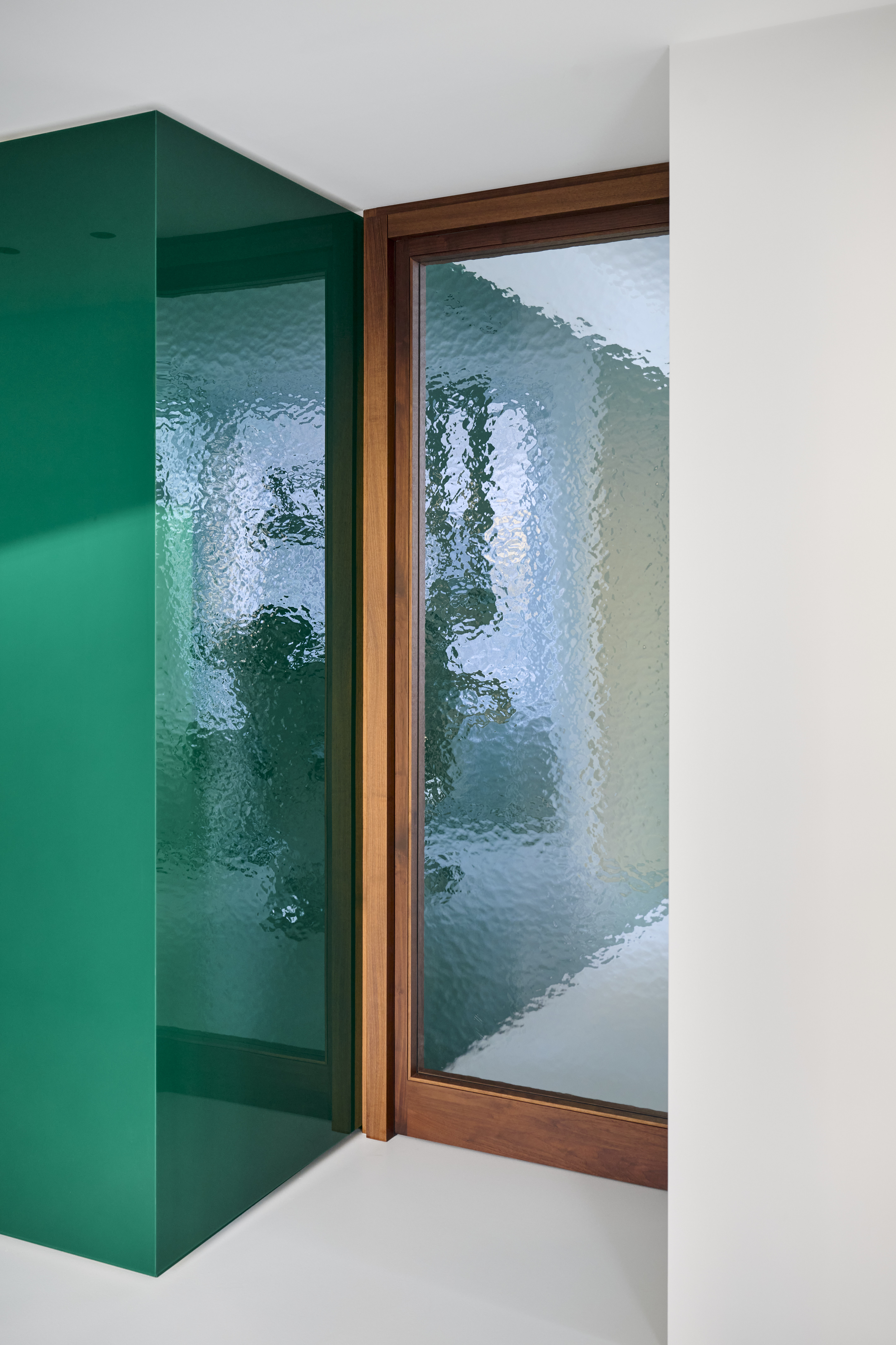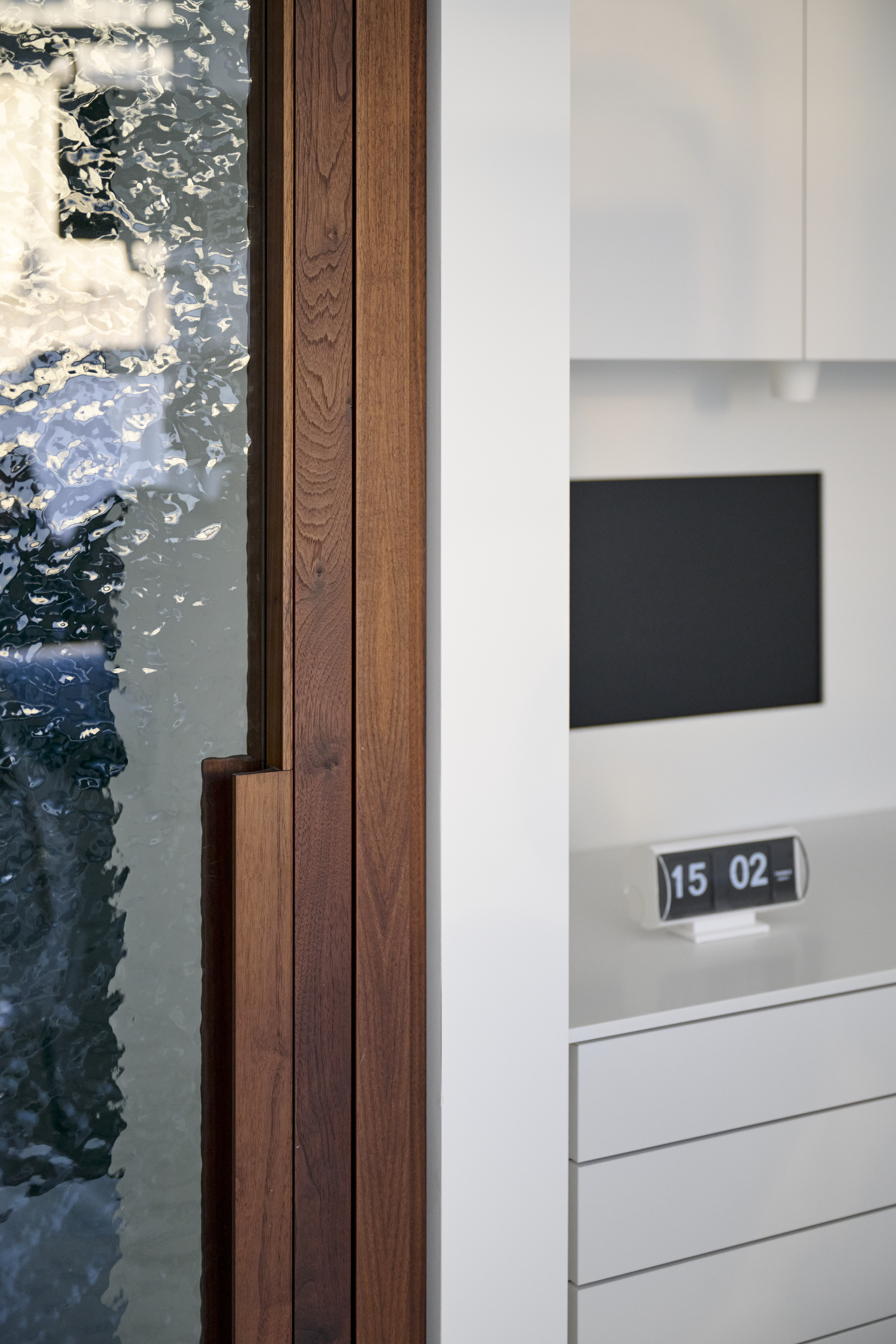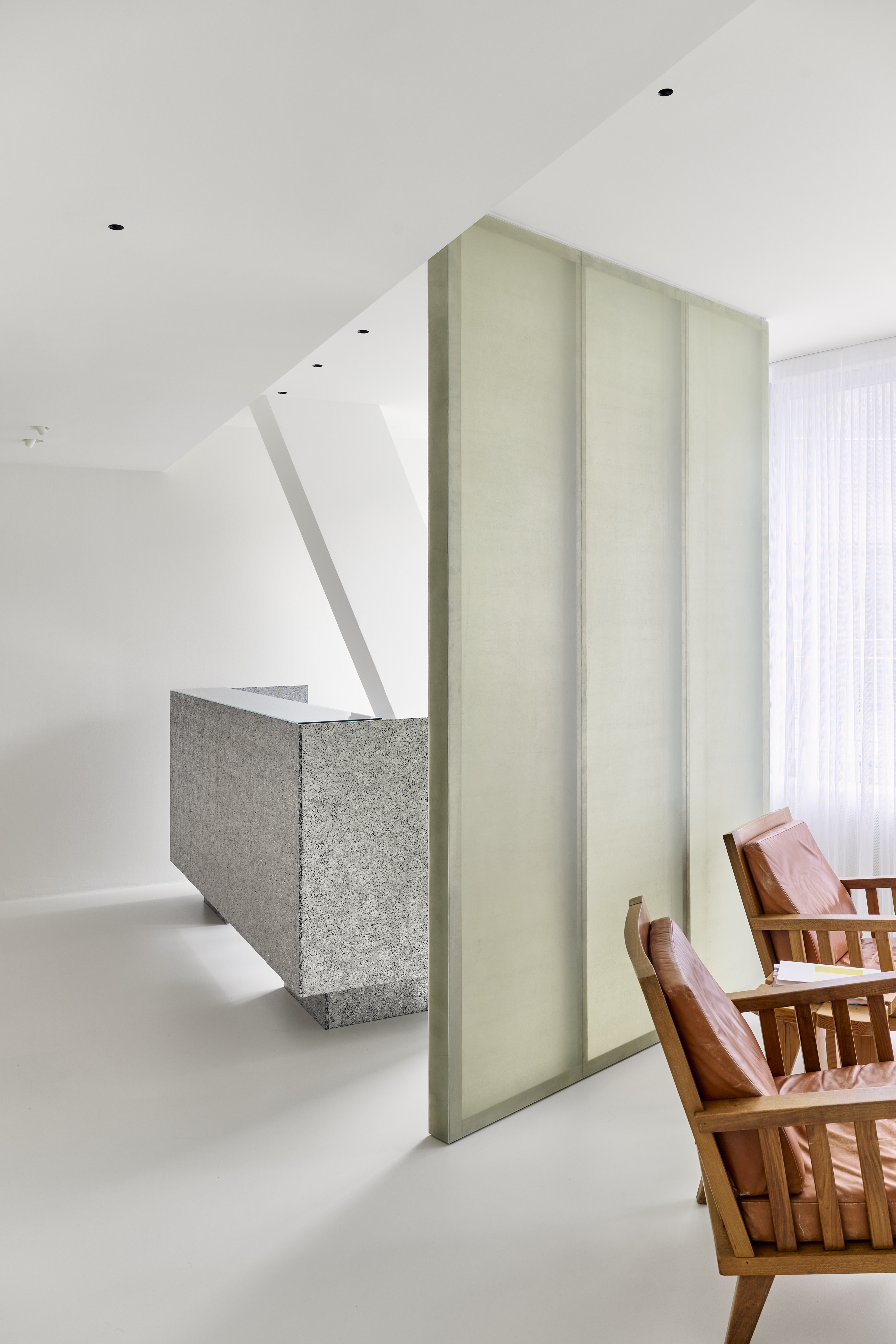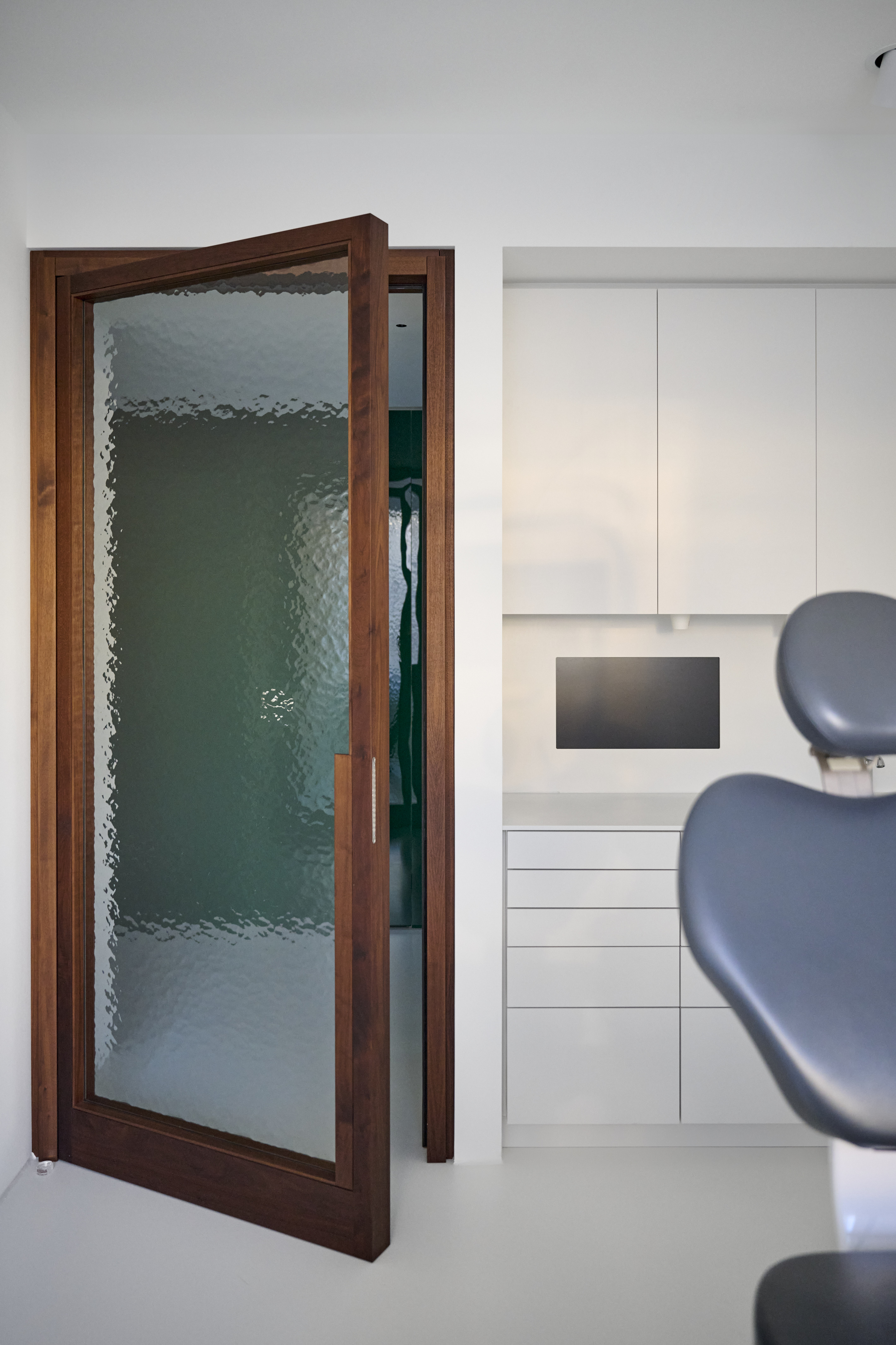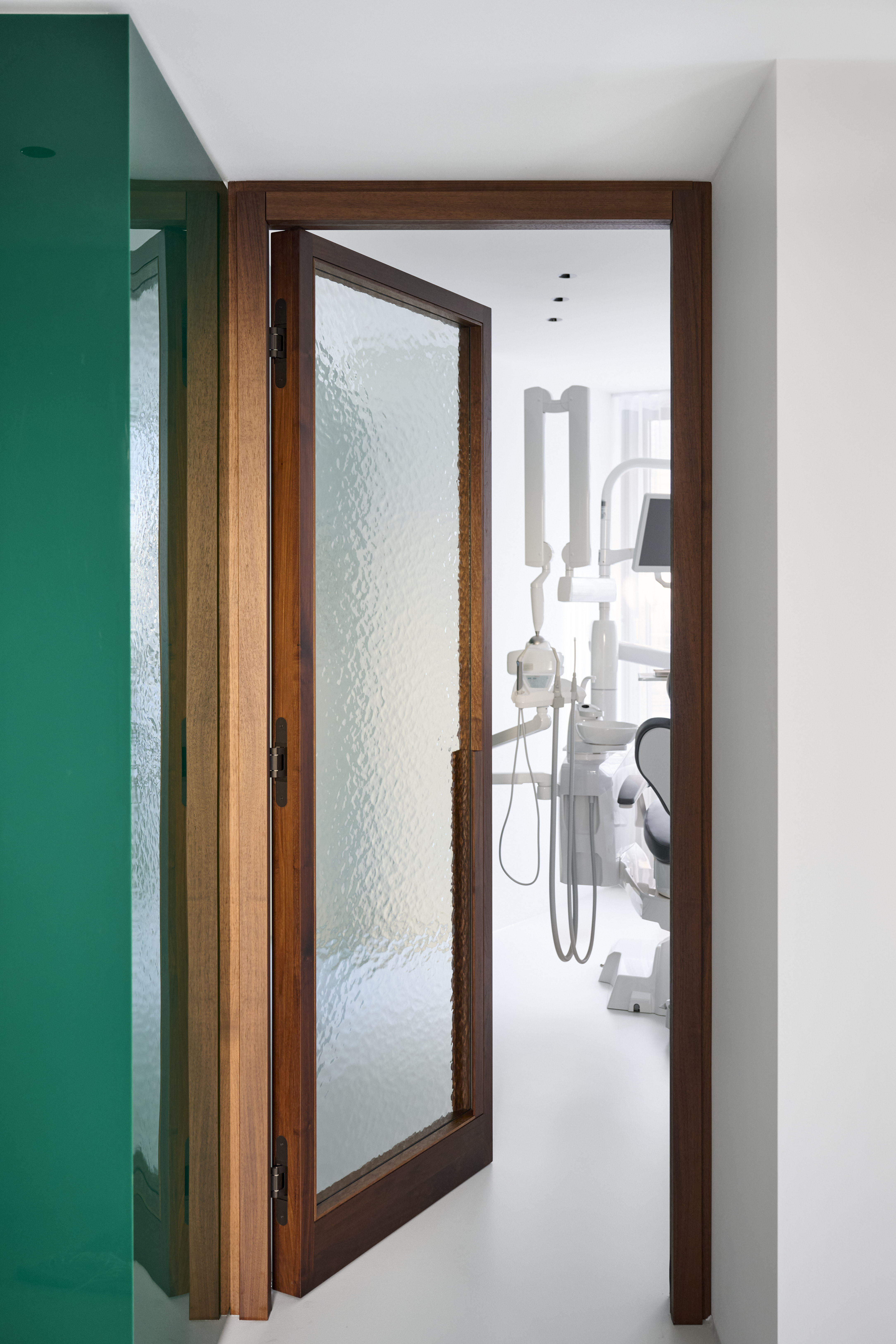 BATEK_T7.2_Daniel_Schäfer_048 치료실 문은 호두나무와 성당 유리로 만들어져 있다. 이 조합은 차가운 미니멀한 재료와 대조를 이루며 따뜻한 감성으로 다가온다. 독특한 유리의 반투명한 특성은 환자의 프라이버시를 해치지 않으면서도 일정한 개방감을 안겨준다. 또한 대기 공간의 새로운 가구와 오래된 가구의 조화로운 연결도 매우 인상적이다.