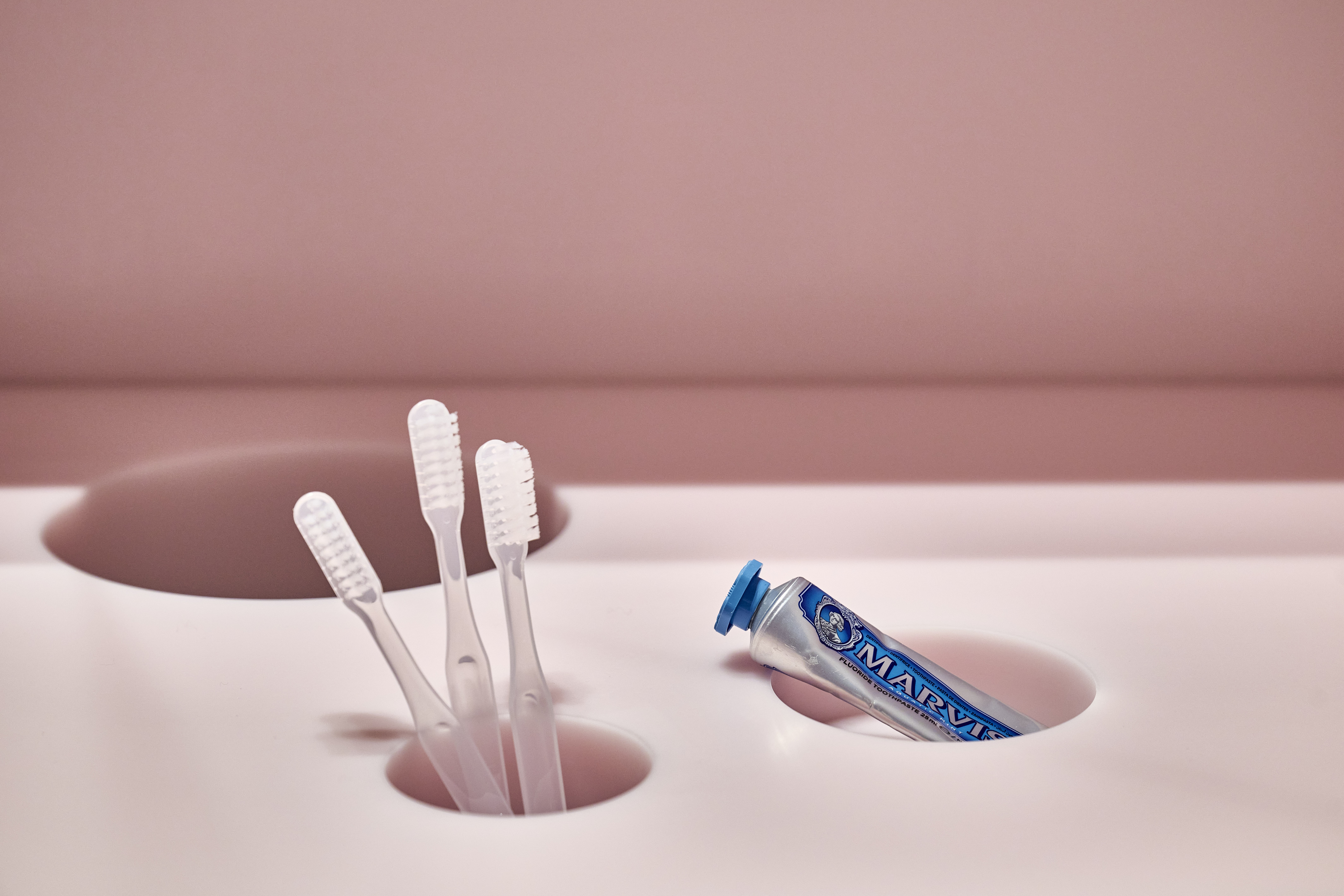 설계팀은 응집력 있고 균형 잡힌 디자인에서 벗어나기 위해 위생 시설의 바닥, 천장, 벽 그리고 비품들을 모두 핑크색으로 채웠다. 이 색상은 개방된 현관을 통해 복도에 비쳐 감도 높은 신선함을 보여준다. 이로 인해 정말 독특하고 매력적인 공간 분위기를 형성한다.