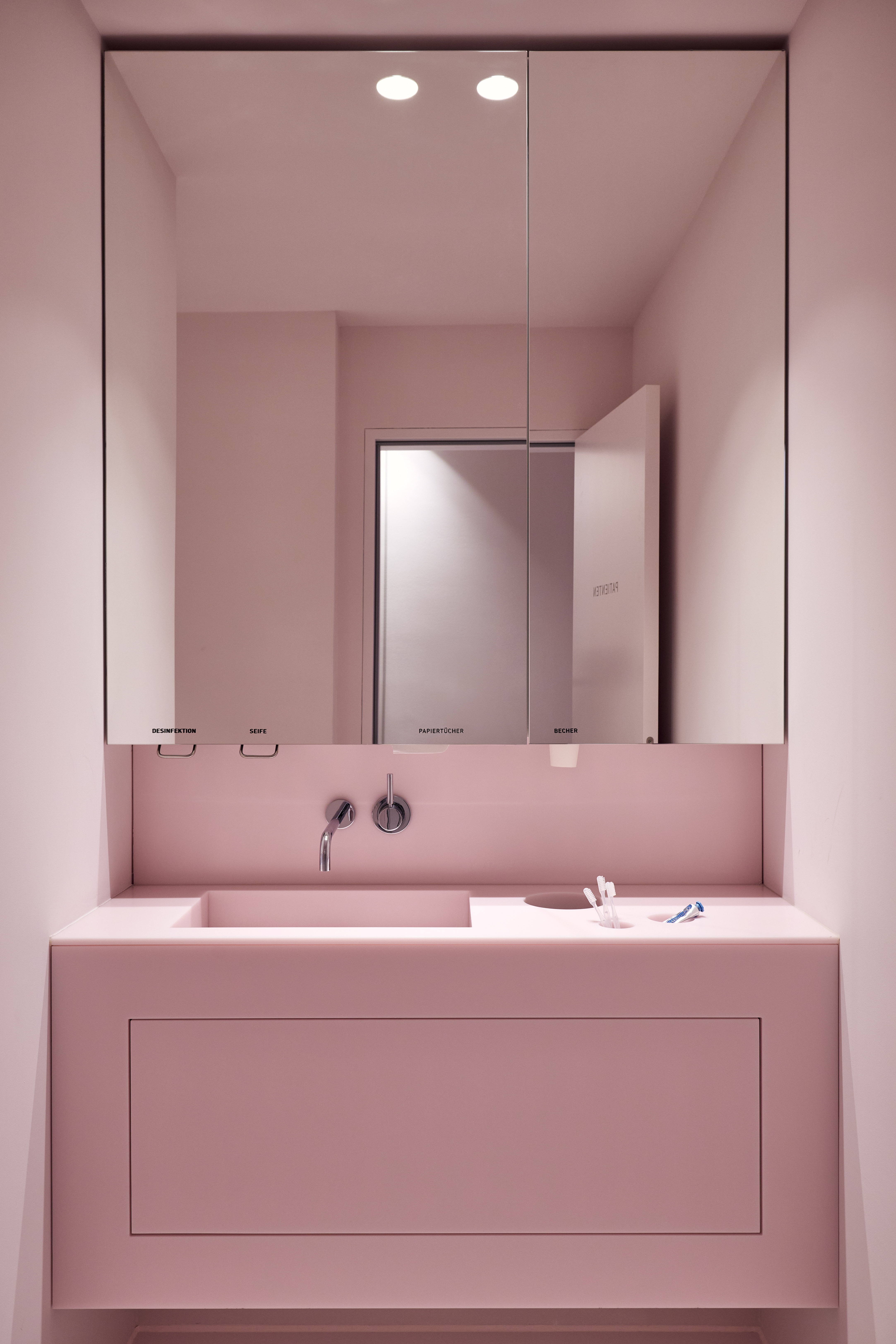 BATEK_T7.2_Daniel_Schäfer_056 이 예방 치과 치료실에서 베이텍 아키텍텐(BATEK ARCHITEKTEN)은 기능적 요구를 충족할 뿐만 아니라 미적이고 사적인 분위기를 조성하는 디자인을 성공적으로 끌어냈다고 볼 수 있다. 또한 현대적인 디자인과 클래식한 요소의 조화, 그리고 혁신적인 재료 선택으로, 이 공간이 순수한 의료 목적을 넘어 독보적인 영감을 주는 장소로 바뀌었다.
