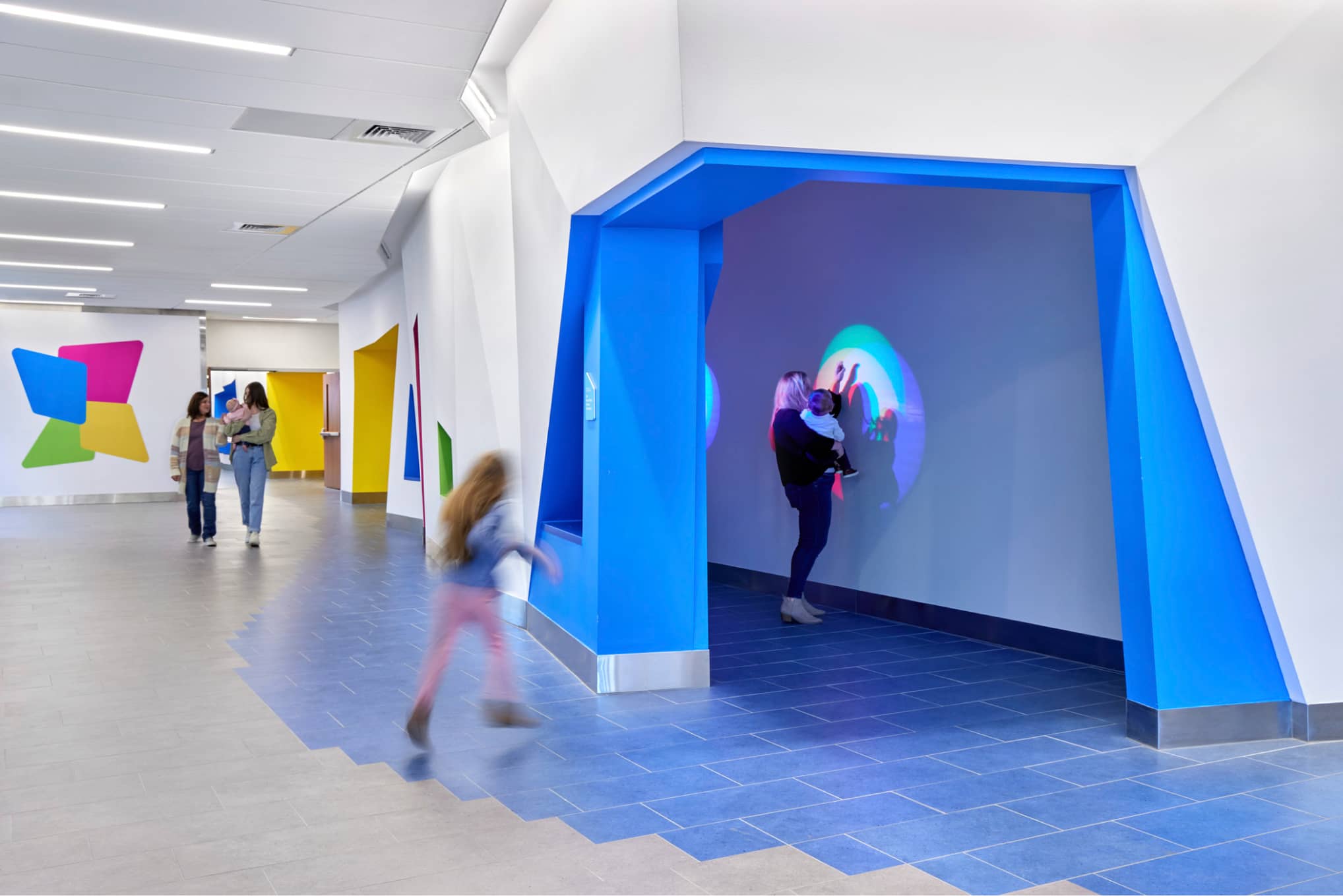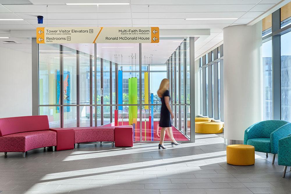 디자인팀은 외부와 내부 디자인 간의 연결을 강화하여 통합적이고 편안한 경험을 조성했다. CHoR의 브랜드에서 영감을 받은 유리 파사드의 다채로운 핀은, 내부에 장난스러운 조각 형태로 나타나며, 이는 예술 및 가구 선택에도 영향을 미쳤다. 또한, 외부에서 파빌리온과 어린이 타워를 시각적으로 통합하는 노란 리본은 내부로도 확장되어 색상과 모티프가 접점 및 수직 이동 수단을 나타내며 병원을 더 쉽게 탐색할 수 있도록 했다.
