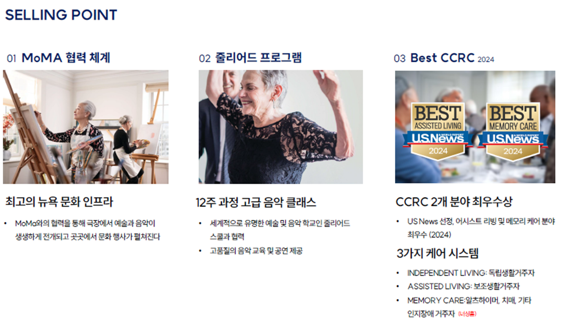 미국의 사례는 한국형 시니어 레지던스가 단순한 노인요양시설이 아니라, 개인의 라이프스타일을 반영한 주거형 커뮤니티로 발전해야 한다는 점을 시사한다. 시니어들의 경제적·문화적 수준이 높아질수록, 그들이 원하는 것은 단순한 ‘노후 돌봄’이 아니라 자신의 정체성과 사회적 관계를 유지하며 살아갈 수 있는 공간이다.