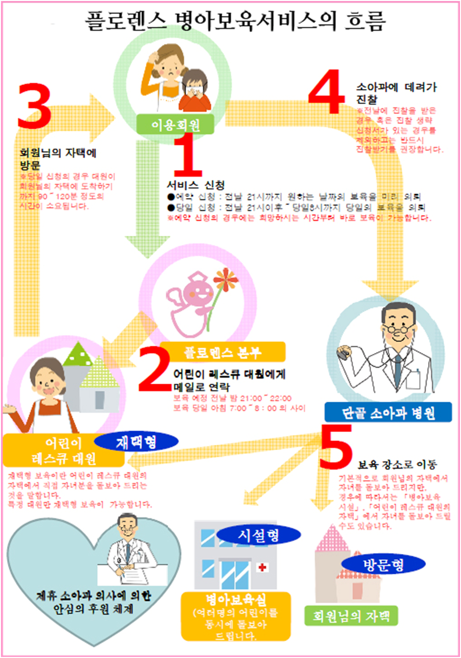 플로렌스에서는 당일 오전 8시까지 보육의뢰를 신청하면 보육사가 2시간 이내에 가정으로 방문해 아이를 소아과에 데려가 진찰하고 자택으로 돌아와 돌보는 ‘어린이레스큐넷’ 서비스를 제공하고 있다. 플로렌스의 서비스를 이용하기 위해서는 입회금 2만 1,000엔과 연회비 1만 5,000엔을 내 ‘플로렌스팩’에 가입해야 한다. ‘플로렌스팩’은 매월 1회의 무료보육을 포함하고 있고 2회째부터 8,000엔 정도의 이용요금을 추가로 내야 한다.