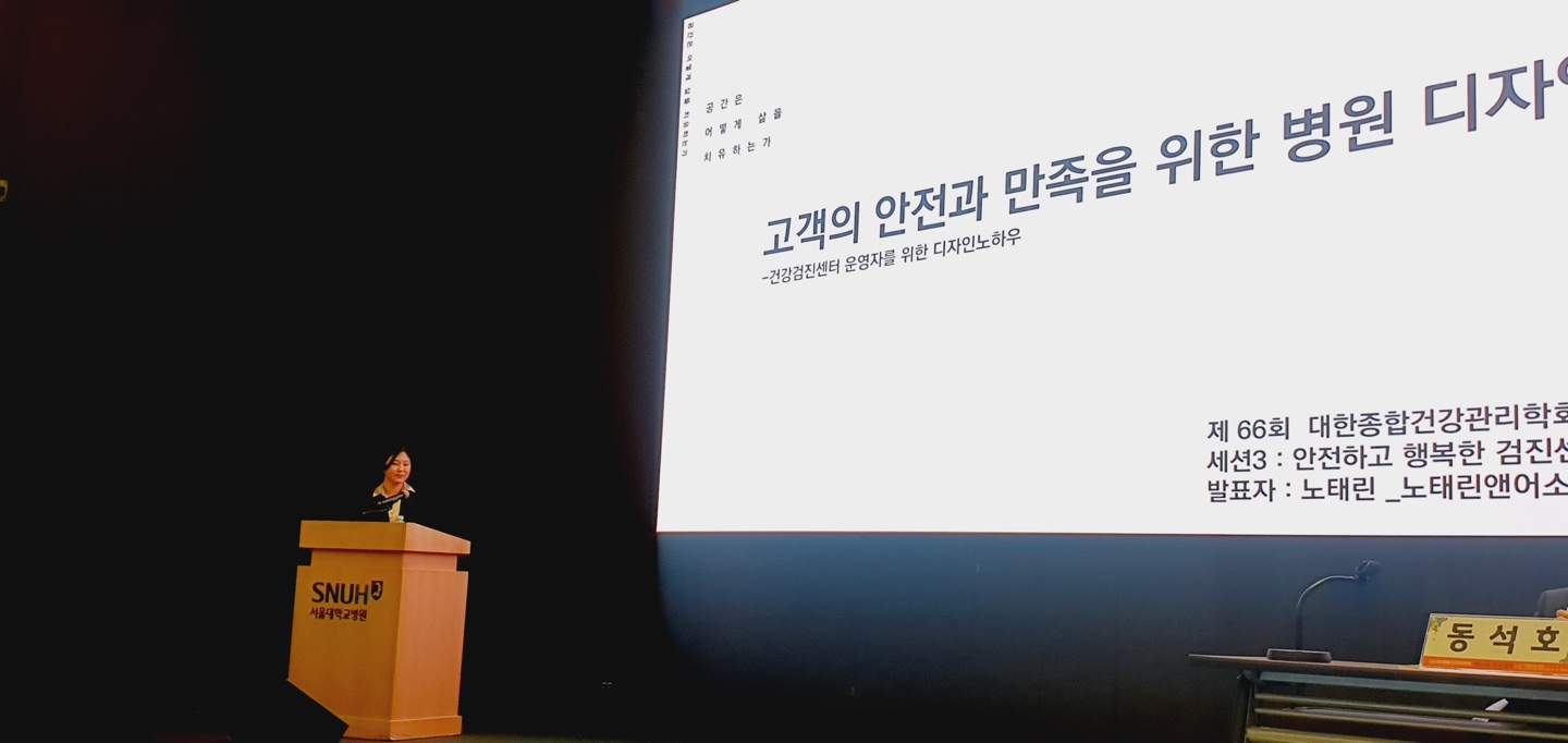 이번 발표에서 노태린 대표는 건강검진센터에서 가장 중요한 안전한 병원 디자인 프로세스와 전략 노하우에 대해 설명하면서, 자신이 직접 디자인했던 건강검진센터를 중심으로 이야기의 실마리를 풀어나갔다. 특히 환자의 입장에서, 혹은 고객의 입장에서, 그리고 공급자로서 ‘건강검진센터를 어떻게 디자인으로 커버할 수 있을까’라는 질문을 던지며, 자신의 견해를 심도 있게 전해주었다.