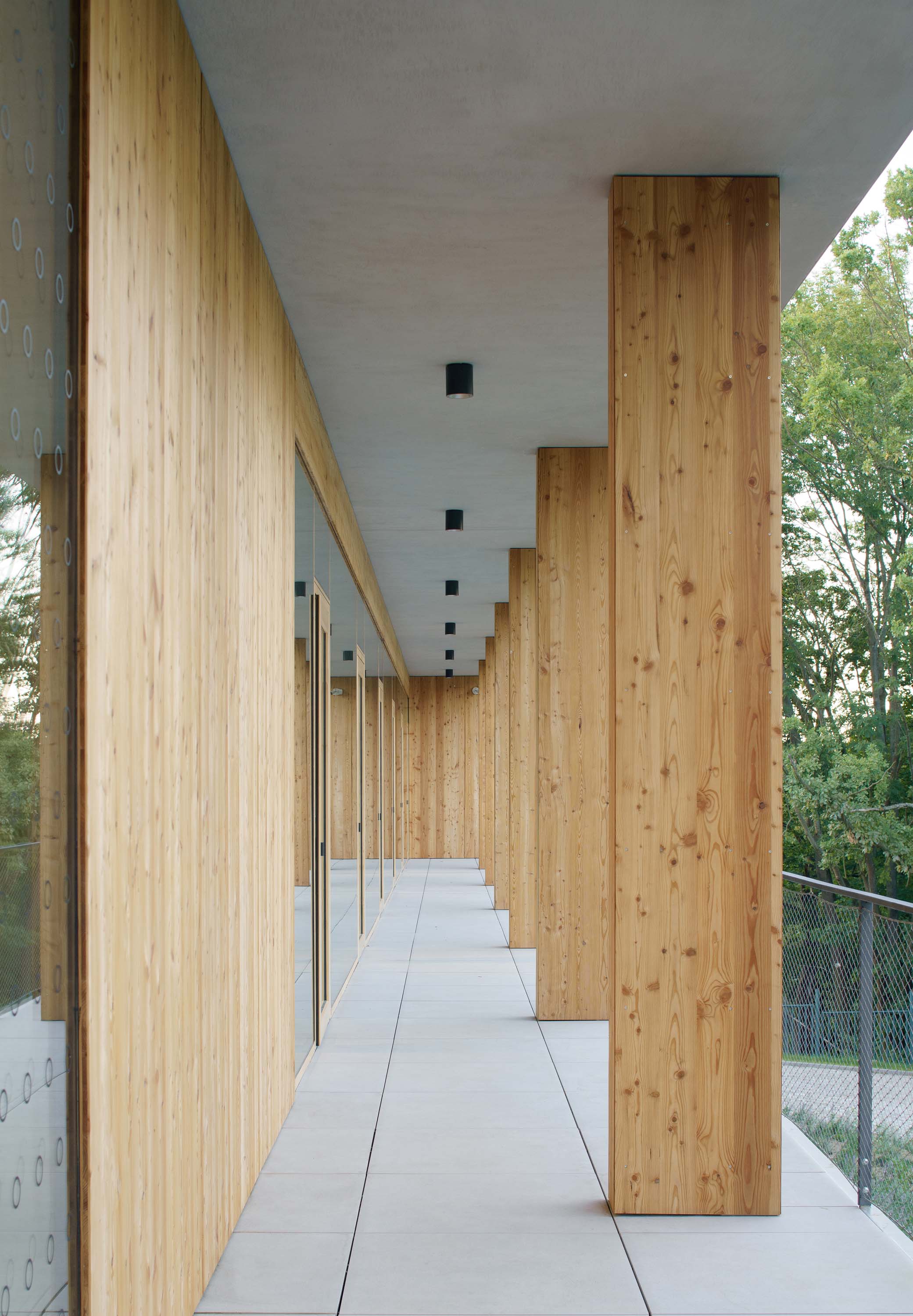 특히 건물이 지형에 크게 묻혀 있기 때문에 주재료로 단일 강화 콘크리트를 사용했다. 이 재료의 미학은 내부와 외부 모두에 반영되어 있으며, 콘크리트 회색의 매끄러운 석고 플라스터가 낙엽송 패널과 나무 프레임의 대형 유리로 보완된다. 또한, 단일 천장의 두드러진 돌출부는 테라스를 덮어 각 출입구에 쉼터를 제공하고, 내부의 과열을 방지하는 수동적인 그늘 역할을 하여 매우 실용적이다. 그만큼 자연과 조화를 이루는 디자인은 공간의 편안함을 더욱 지속시켜 주기에 충분하다.