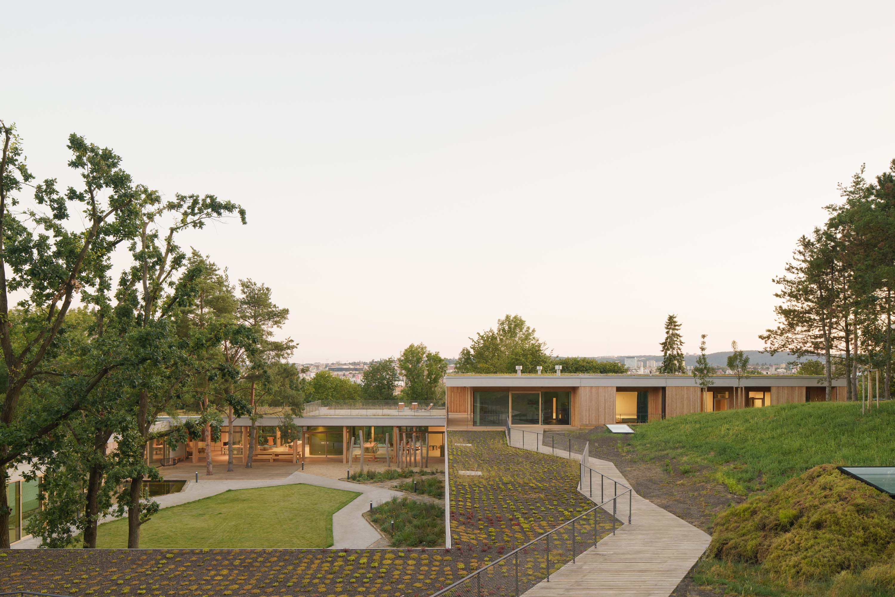ČTYŘSTĚN Dětský hospic Dům pro Julii - photo by alex shoots buildings ČTYŘSTĚN Dětský hospic Dům pro Julii - photo by alex shoots buildings ČTYŘSTĚN Dětský hospic Dům pro Julii - photo by alex shoots buildings ČTYŘSTĚN Dětský hospic Dům pro Julii - photo by alex shoots buildings 난방과 냉방은 콘크리트와 섬유 시멘트 천장에 내장된 관 시스템을 통해 관리된다. 이 시스템은 지하층 외관의 틈새에 숨겨진 세 개의 공기-물 열펌프에 의해 공급되어 매우 효율적이다. 또한, 생태 지붕에 있는 토양과 녹지가 실내의 과열을 방지하고, 빗물을 모아 흐름을 늦추며, 건물이 주변 지형과 잘 어우러지도록 돕는다. 과도한 빗물은 큰 지하 탱크에 모아져 정원 연못에 공급되고, 안뜰의 나무와 잔디를 관개하는 데 사용되어 자연을 고려한 지속 가능한 설계가 돋보인다.