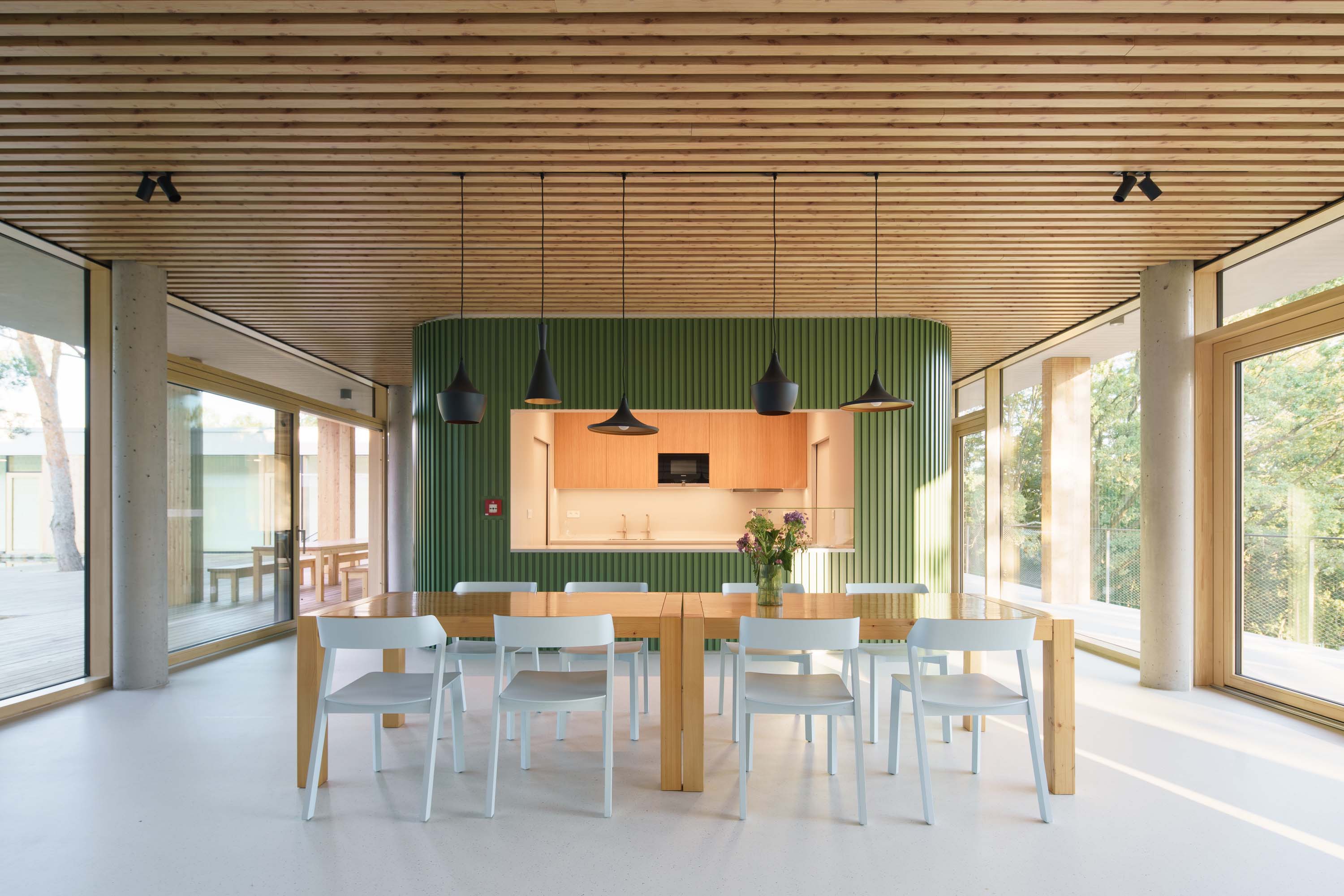 입구 오른쪽에는 양쪽 테라스로 연결된 넓은 공동 식사 공간이 있다. 이 공간은 방문객들과의 만남, 사회적 활동, 그리고 공동 식사를 위한 모임 공간으로 사용되며, 따뜻하고 친근한 분위기가 느껴진다. 중앙 주방 블록 뒤에는 환자와 가족들을 위한 더 사적인 공간도 마련되어 있다. 특히 편안하게 쉴 수 있는 라운지와 벽난로가 있어 가족들이 서로 소통하고 휴식을 취하기에 적합하다.