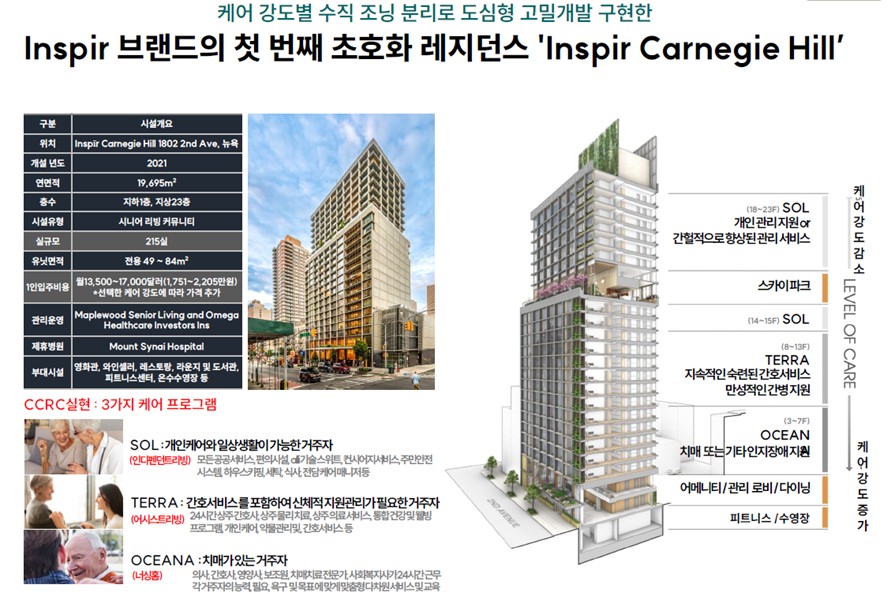 아래 사례는 미국 뉴욕의 인스피르 카네기 힐 (Inspir Carnegie Hill)의 사레를 보면 4가지 케어 강도별 상품을 하나의 단지에 , 그리고 하나의 타워에 복합해 개발함으로서 모든 시니어 생애에 대한 케어를 한 단지에서 가능토록 했다.