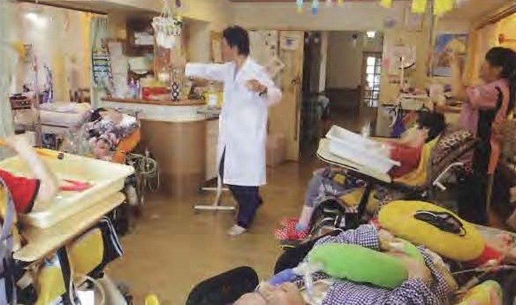 비와코학원은 서일본 최초로 개설된 중증 심신 장애아동(중도의 신체적 장애와 지적 장애를 가진 어린이)를 위한 시설입니다. 침대에 누운 채로 인공호흡기가 없으면 생명 유지를 할 수 없는 아이와, 신체 장애 상태에 맞춰 주문 제작한 침대같은 휠체어에 앉아 있는 아이, 신체 장애는 가벼운 정도이나 지적 장애에 의하여 행동에 제약이 있는 아이 등 크나큰 장애와 함께 앞으로의 길고 긴 인생을 살아가야만 하는 아이들의 존재가, 그때 비로소 처음으로 나 자신에게도 관련이 있는 세상으로 인식된 것이었습니다.