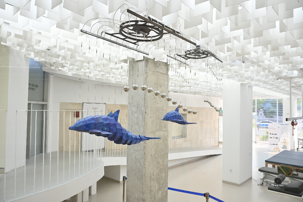 이 조형물이 설치된 곳은 창가 앞 책상 위로, 주로 노인 환자분들이 재활치료를 받으시는 공간입니다. 삭막한 병원 환경 속에서 리드미컬하게 움직이는 고래의 모습은 환자들에게 정서적 안정과 시각적 자극을 제공하며, 인지치료 측면에서도 긍정적인 효과를 주고 있는 것으로 보입니다.