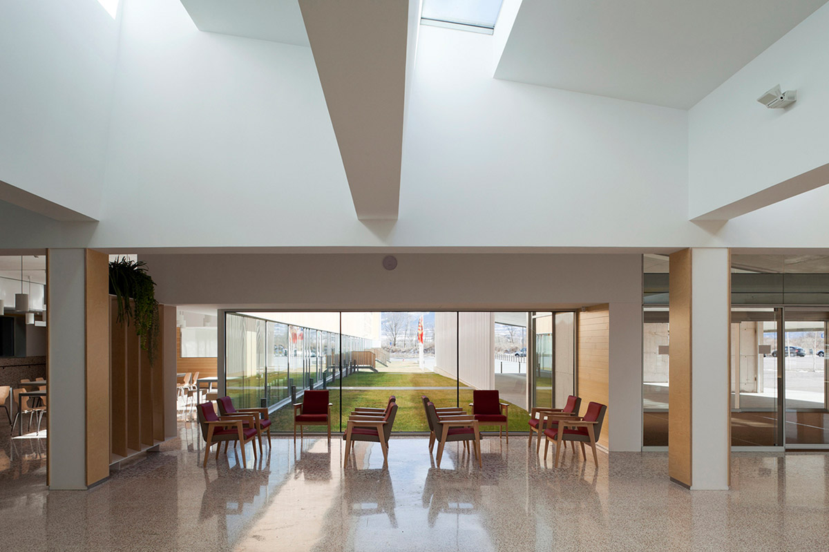 특히 남향의 경사지붕은 건물 전체가 풍부한 채광과 조망을 확보하는 데 있어 중요한 역할을 하며, 건물을 가로지르는 천창을 통해 그 역할을 극대화한다.