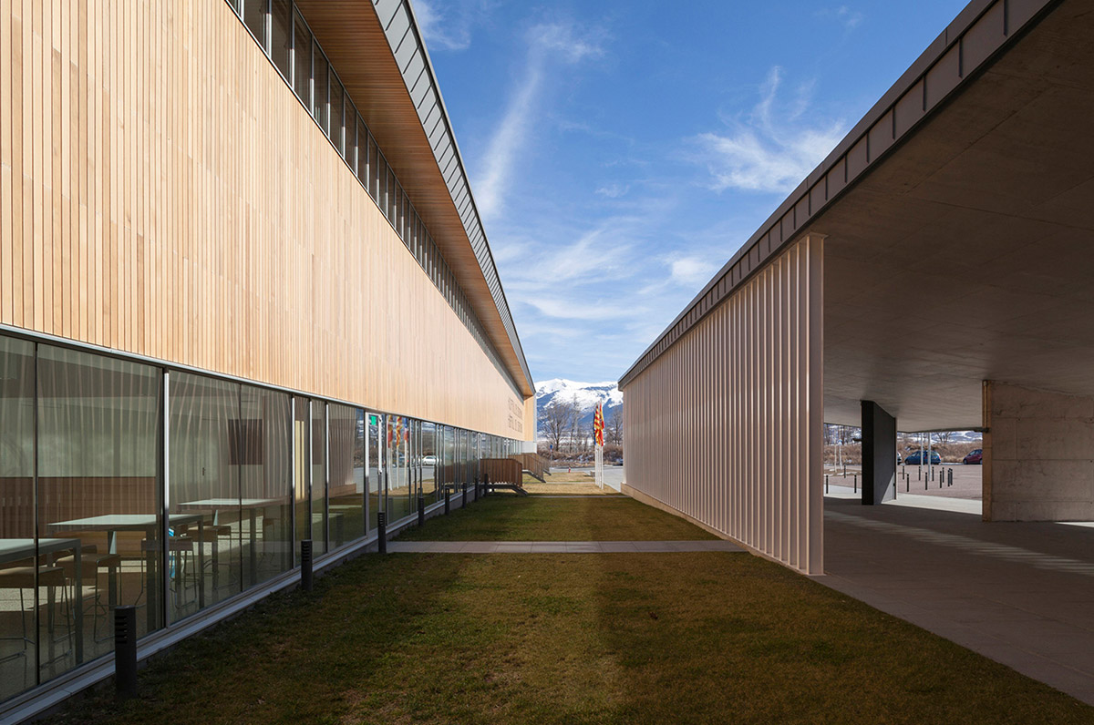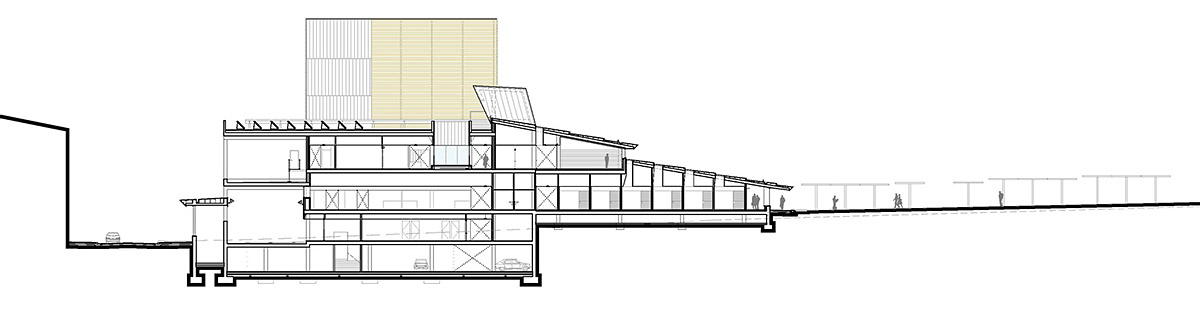 북쪽에서 남쪽으로 흐르는 경사지붕은 기능적 역할 외에도 시각적으로 광장과 연결되어 낮은 자세로 주변 풍경과 하나가 된다.