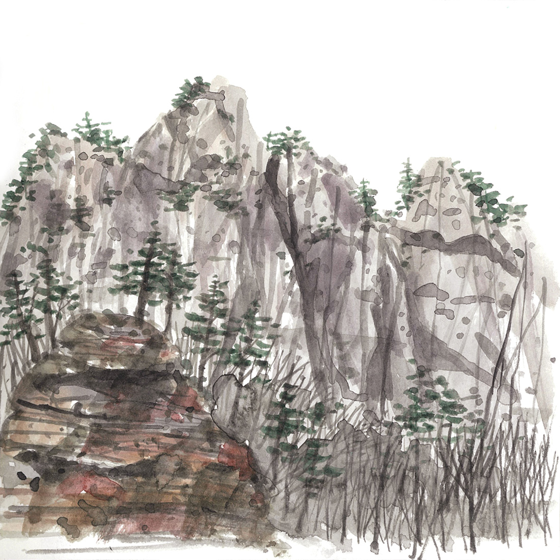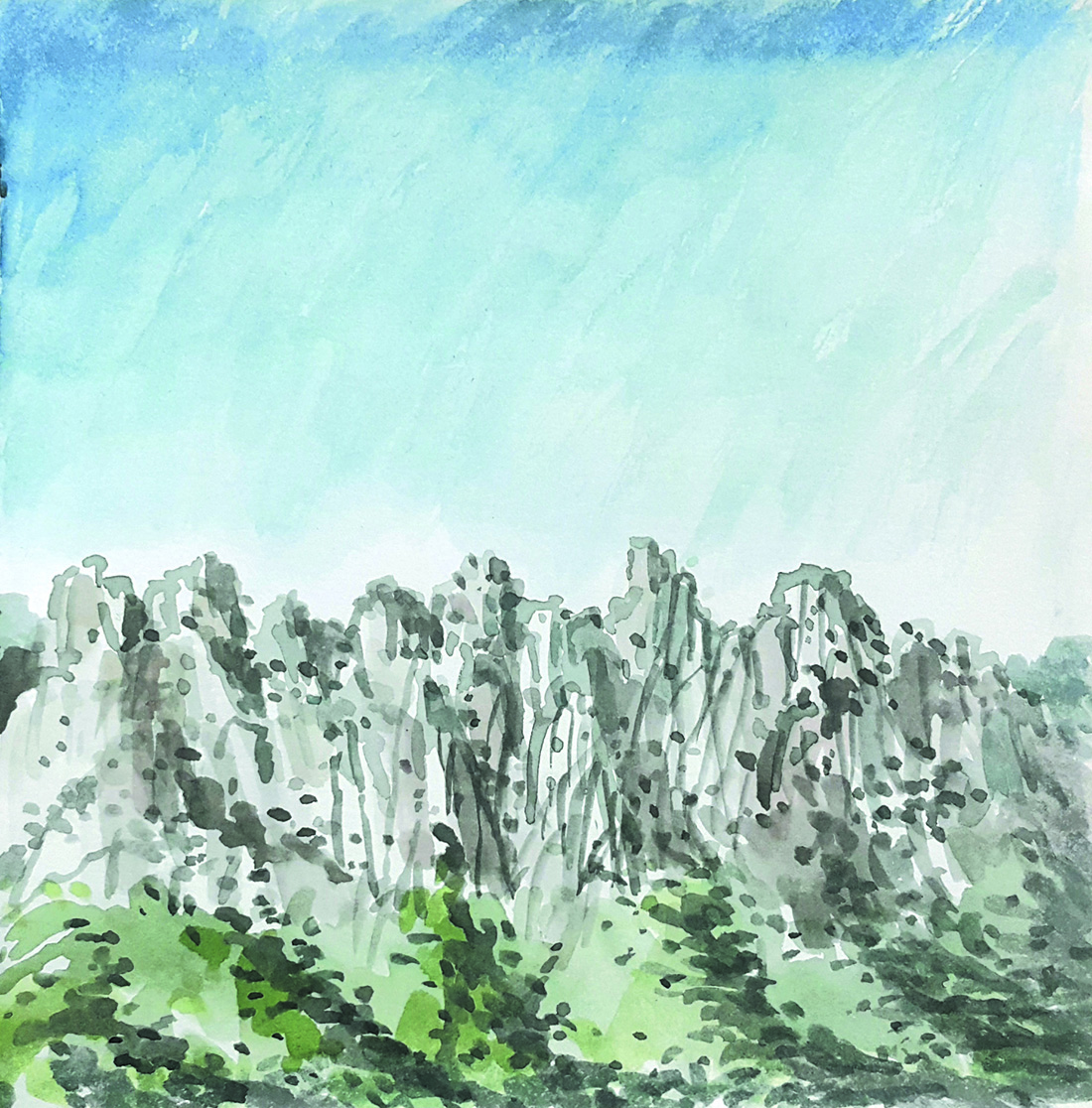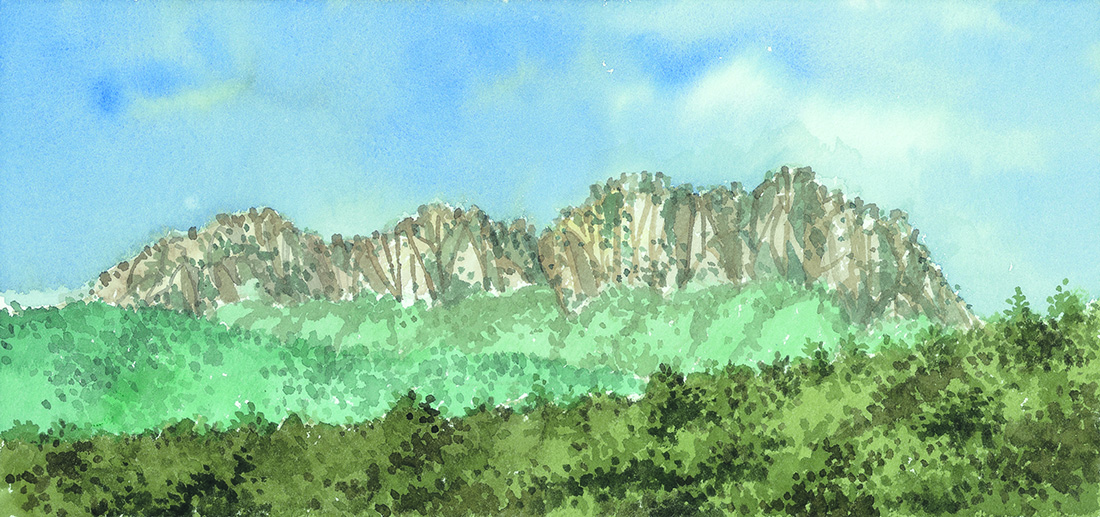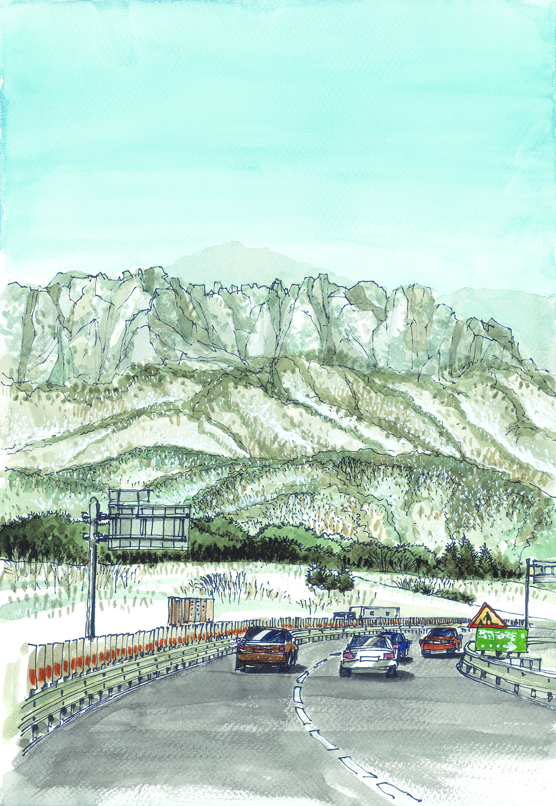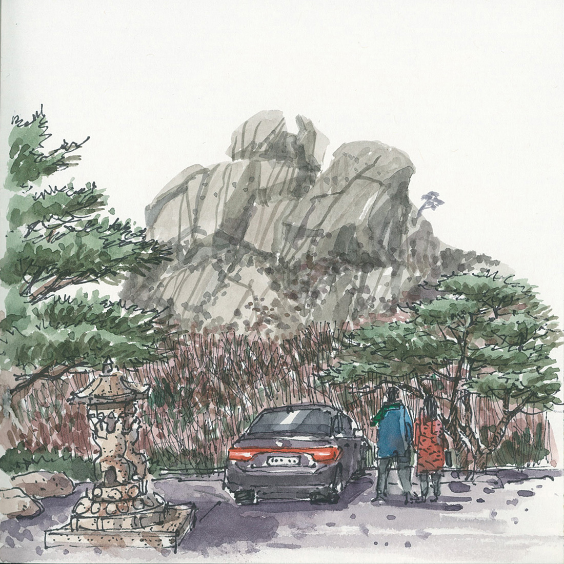 서울로 돌아오는 길에 미시령터널로 향하면 울산바위가 도열한 채로 환송인사를 건넨다. 산림을 거느리고 상부에는 마치 수정처럼 울산바위 능선의 뾰족거리는 바위들의 행진과 다양한 표정은 도로에서 멈추고 순간을 포착해서라도 카메라에 담고 싶어진다. 겨울에 잔설이 보이는 풍경도 스케치 욕구를 자극한다.