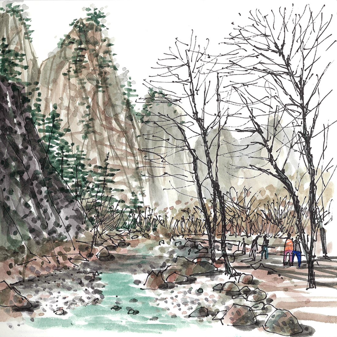 내리막이라 힘들지 않게 걷는 산책로에는 드문드문 목제 출렁다리도 있어 다리 중간쯤에 서서 동양화 한 폭을 배경으로 기념사진도 찍어본다. 기암절벽의 중첩된 바위는 장엄한 크기를 자랑하고 중간 중간에는 소나무가 박혀있어 신선의 세계를 상상하게 한다. 겨울나무들은 제각기 옷을 벗고 침묵 속에서 동안거(冬安居) 수행에 정진하고 있다. 사방은 조용한데 얼음장 밑으로 계곡물 흐르는 소리는 시공간을 초월하는 듯하다.