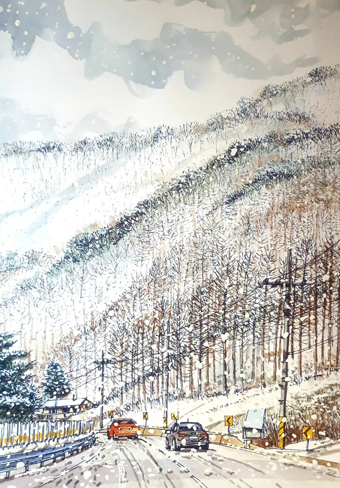 강원도 속초에 다녀오는 겨울 길은 춥고 을씨년스럽다. 특히 눈이 내리면 도로의 풍경은 감성적으로 뒤바뀐다. 마른 가지의 겨울 산에는 함박눈이 소리 없이 쌓이고 점점 굵어지는 눈 속에 풍경은 함몰된다. 이미 도로 위에는 사람의 발자국과 차량의 흔적들이 시간의 켜를 두고 어지럽게 중첩되고 있다. 다음 겨울이 또 기대된다.