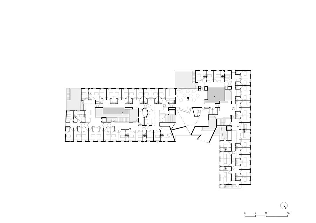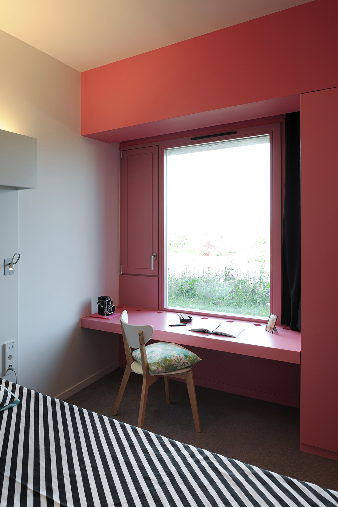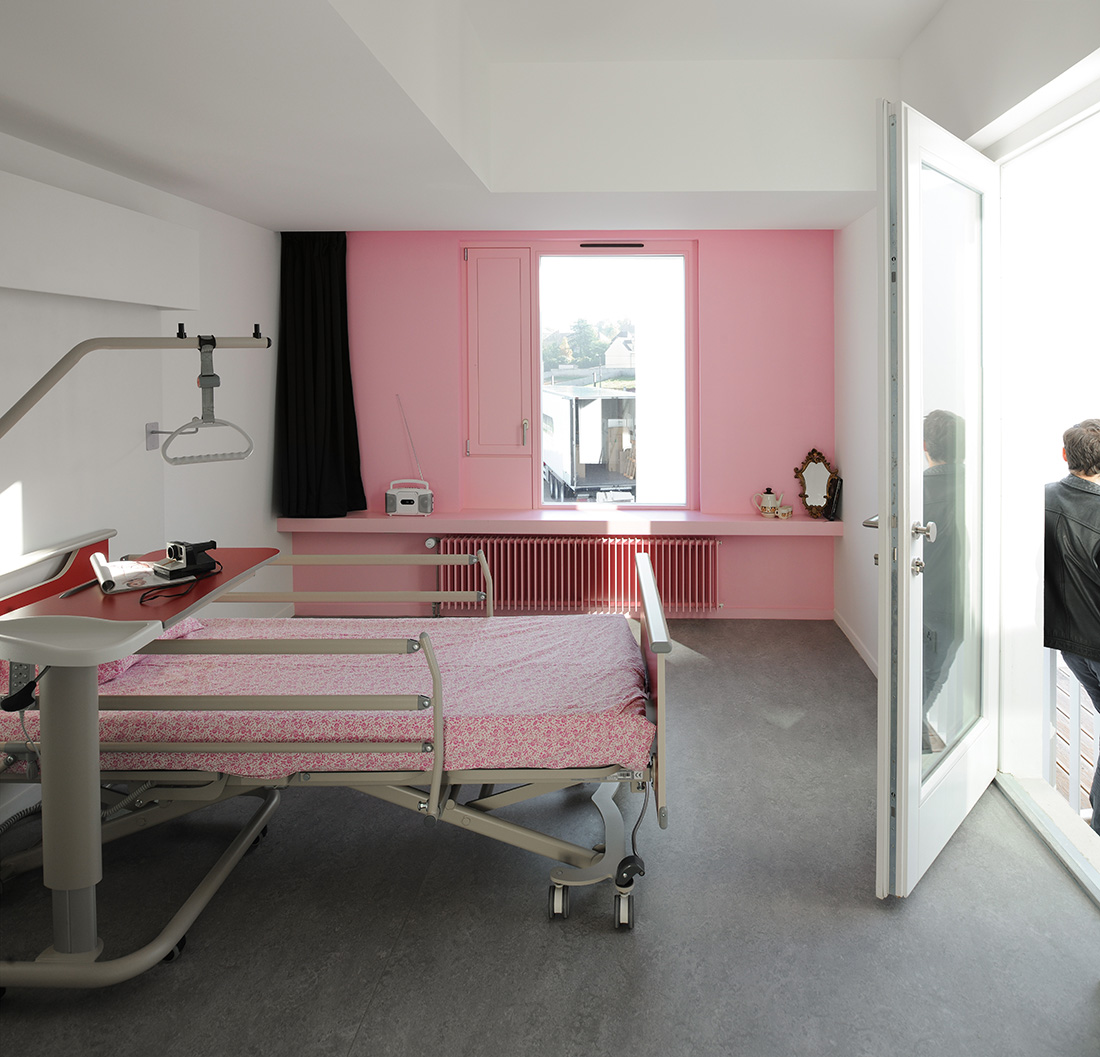 20㎡ 크기의 룸은 매우 세심하게 설계되었고, 베이 창문과 가구 배치의 조화는 외벽의 두께감을 더욱 강조해 준다. 옐로우와 핑크, 민트그레이의 세 가지 유형의 방은 다양성을 추구하고 있으며, 각기 다른 색상별로 태양의 움직임을 고려한 디자인이 돋보인다. 각자의 방에서 보이는 외부 에너지와 내부의 색채는 서로 조화를 이루며 노인 환자들에게 편안함을 주도록 연출된 점이 인상 깊다.