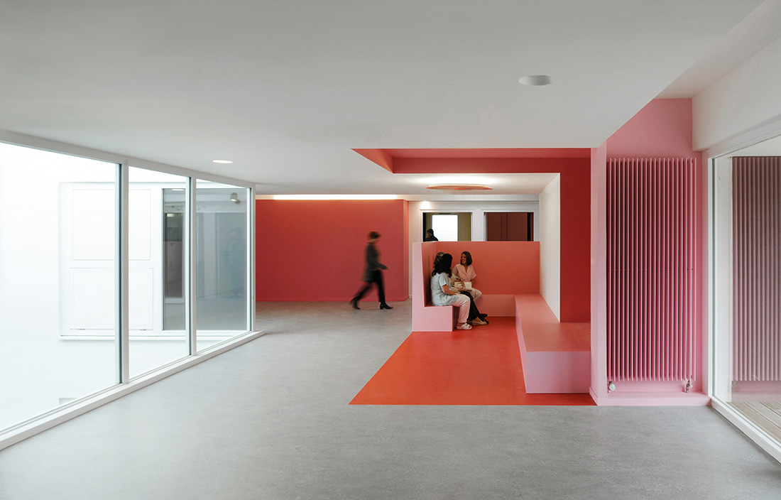 건물에는 두 개의 파티오가 깊이감을 더해주고, 모든 통로에는 자연광이 들어와 산책하기에 매우 이상적이다. 파티오는 방향이 바뀌는 곳마다 넓어지면서 따뜻한 핑크와 레드 계열로 꾸며진 휴식 공간으로 이어진다. 특히 인체공학적으로 설계된 벤치에는 거주자들이 함께 이야기를 나누며 소통할 수 있도록 편리하게 배치되었다.