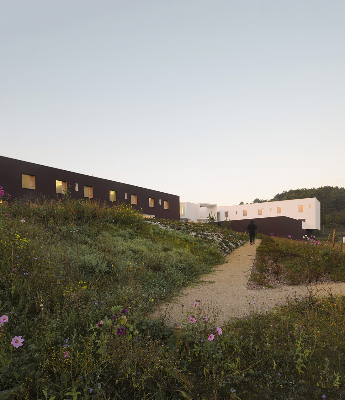 경사진 지형에 자연스럽게 어우러지도록 설계된 노인 요양원은, 92개의 거주자용 룸 + 1개의 게스트 룸(14개의 객실이 있는 알츠하이머 병동 1개), 접수 공간 및 애니메이션 센터, 의료 및 의료 상담실, 행정 및 직원실, 물류 및 기술실, 크롤 스페이스(천장이나 마루 밑의 배선·배관 등을 위한 좁은 공간)로 구성되어 있다. 입구는 마을 광장을 닮은 안뜰 주위에 배치되어 있으며, 욘느 계곡을 향하고 있다.