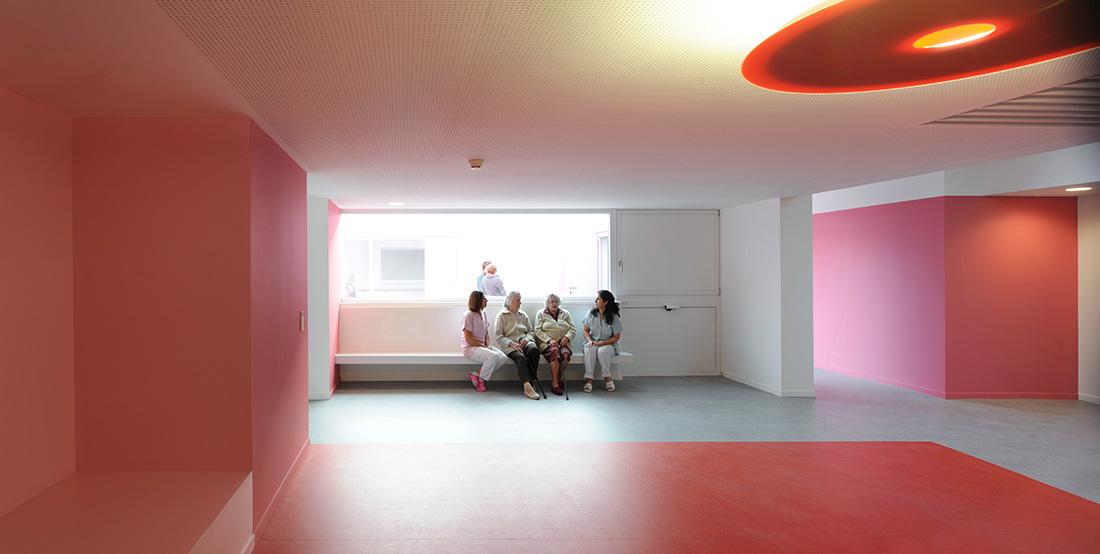 또한 핑크와 레드 컬러로 각 구역별 포인트를 준 점도 눈여겨 볼 부분이다. 이러한 컬러감은 공간의 재미와 리드미컬한 율동감을 안겨주고 있다. 이 역시 노인 환자들에게 시각적 자극을 열어주고 공간을 구분할 수 있는 요소로 작동된다. 바닥과 벽면을 장식하는 따스한 컬러감은 공간에 활기를 띠고 밝은 기운의 에너지로 다가온다. 이러한 치유 환경은 노인들의 삶의 원동력이 될 것으로 기대된다.