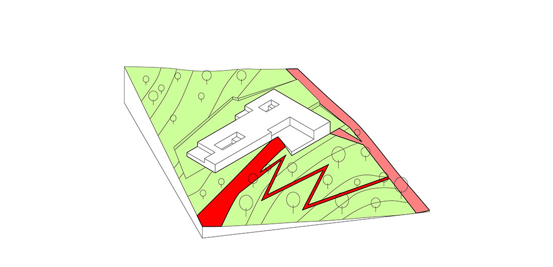1) 건물은 경사면을 사용하여 풍경과 부드럽게 합쳐지도록 계획되었다.