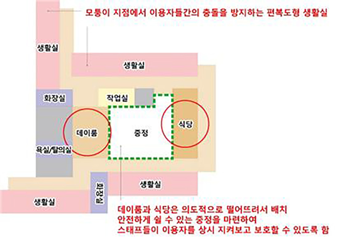 ① 공용 생활실은 편복도로 구성하고, 복도가 꺾이는 모퉁이 지점에서는 이용자들 간의 충돌이 일어나지 않도록 할 것