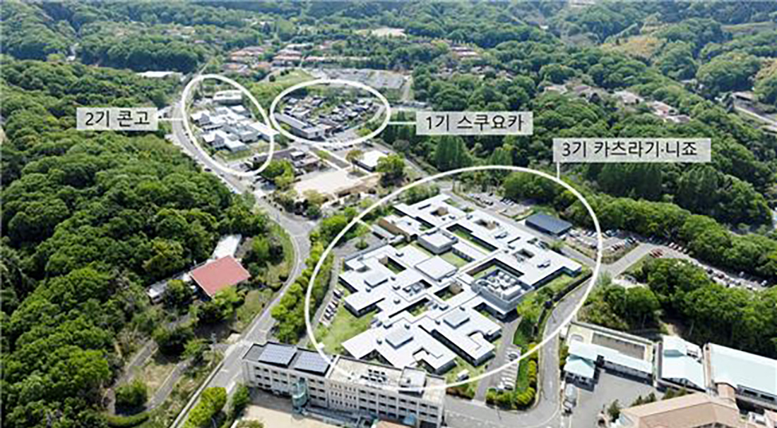이 프로젝트는 당시 오사카부립 콘고 콜로니의 노후화에 따른 전체 재편 프로젝트로, 전화에서 소개했던 비와코 학원이 준공된 직후의 공모에서 당선된 계획입니다. 우리는 전체적 재편 정비 계획을 입안한 후에 2007년에는 중증 심신 장애인 및 장애아동을 위한 시설인 "스쿠요카", 2014년에는 본 시설에의 입소 등을 지원하기 위한 시설인 "콘고", 2017년에는 역시 입소 지원 시설인 "카츠라기·니조" 이상 3건의 프로젝트를 설계했습니다. 이곳은 어린이부터 노인까지 다양한 연령층이 녹음이 우거진 환경 속에서 생활 및 활동할 수 있는 장소입니다.
