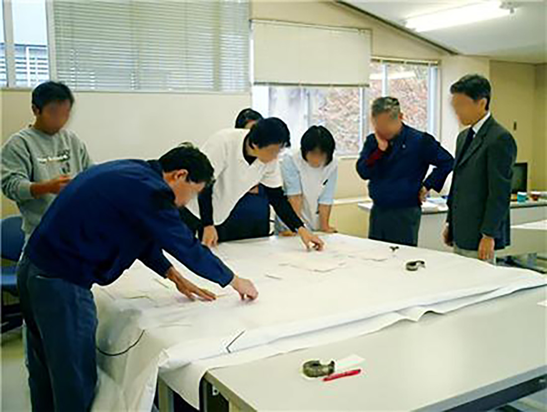 아래 사진은 "카츠라기·니죠" 설계 진행 당시의 워크숍 모습입니다. 대여섯 명의 스태프들이 테이블을 둘러싸고 앉아서 직접 책상 위에 '카드'들을 나란히 늘어놓습니다. '카드'는 건물에 필요한 공간들을 50분의 1의 축척으로 잘라낸 두꺼운 종이로, 스태프들은 이 '카드'를 퍼즐처럼 자유롭게 배치해 가면서 다각도로 논의함으로써 공간이 갖추어야 할 이상적인 모습에 대하여 검토해 가는 과정입니다.