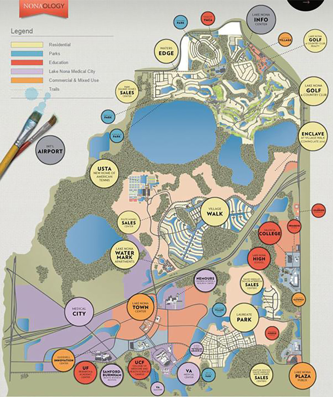 타비스톡이 센트럴 플로리다 의과대학 설립을 지원하기 위해 1,250만 달러를 기부했다. 첫 번째 입주 업체로 샌퍼드–번햄 의학연구소가 확장의사를 밝히면서 약 6만 평의 땅을 기부한 것이 레이크 노나의 시작이었다. 샌퍼드–번햄 연구소와의 계약 성사로 다른 기관들도 모여들기 시작했고 재향군인 병원, 누모로스 어린이 병원, MD앤더슨센터와 플로리다 대학교까지 유치하면서 레이크 노나는 명실상부한 의료복합단지의 기반이 마련되었다.