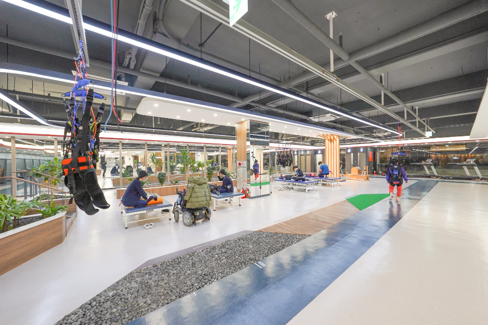 센터 내에는 50m, 100m 길이의 보행 트랙, 높이가 다른 계단 및 경사로, 그리고 자갈, 목재, 잔디 등 다양한 바닥 질감을 반영한 환경들이 배치되어 있어 실제 생활 환경에 가까운 재활 경험을 제공합니다. 이러한 구성은 치료의 효율성과 환자의 접근성 모두를 만족시킬 수 있는 구조로, 환자뿐만 아니라 치료진에게도 매우 큰 만족을 주고 있습니다.