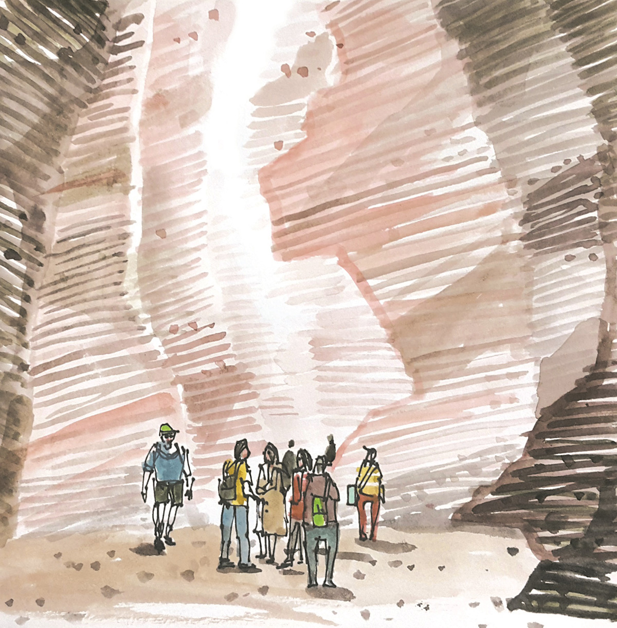 엔탈로프캐년 그랜드캐년 인근에 위치한 엔탈로프캐년은 초현실적 분위기를 연출한다. 나바호족의 관할이라 그의 안내를 받아야 입장이 가능하다. 고운 모래가 압축되어 이루어진 사암의 바위 속을 오랜 세월 동안 빗물이 침투해 조각한 자연 동굴이다. 자연광은 가느다란 협곡의 바닥까지 도달한다. 바닷가의 주상절리처럼 주름진 벽면마다 주홍색의 문양을 아로새기며 겹겹이 레이어 룩을 연출한다. 마치 방금 전에 목욕을 마친 여인의 살결처럼 부드럽고 관능적이다. 혹은 어떤 거대한 짐승의 내부 같은 이토록 이색적인 경험은 아마도 오래 가슴 속에 각인될 것 같다. 카메라를 대는 곳 마다 초현실적인 장면이 담긴다. 깊고 어두운 동굴 속에서 빛이 연출하는 예술은 때로 제임스터렐의 작품을 연상하게 한다.