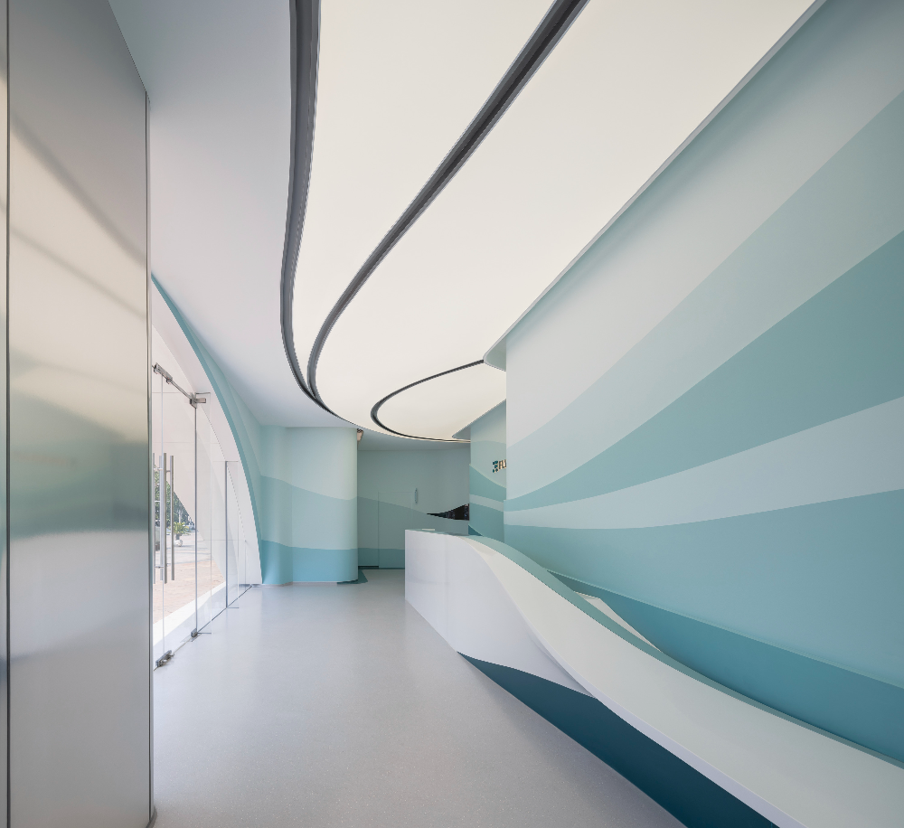 FlySolo는 아이들을 격려하고 응원하는 공간으로서, 그 정체성이 건물의 외관에 잘 드러나 있다. 입구를 감싸는 곡선형의 파사드와 내부의 파도 모양 그래픽은 서로 어우러져 따뜻하고 환영하는 분위기를 만들어준다. 특히, 진줏빛 화이트 알루미늄 프레임과 정교하게 제작된 곡선 패널들은 감정적으로 힘든 여정을 시작하는 가족들에게 새로운 가능성에 대한 영감과 희망적인 메시지를 전달하며, 아이들에게도 따뜻한 환영의 의미가 담겨 있다.