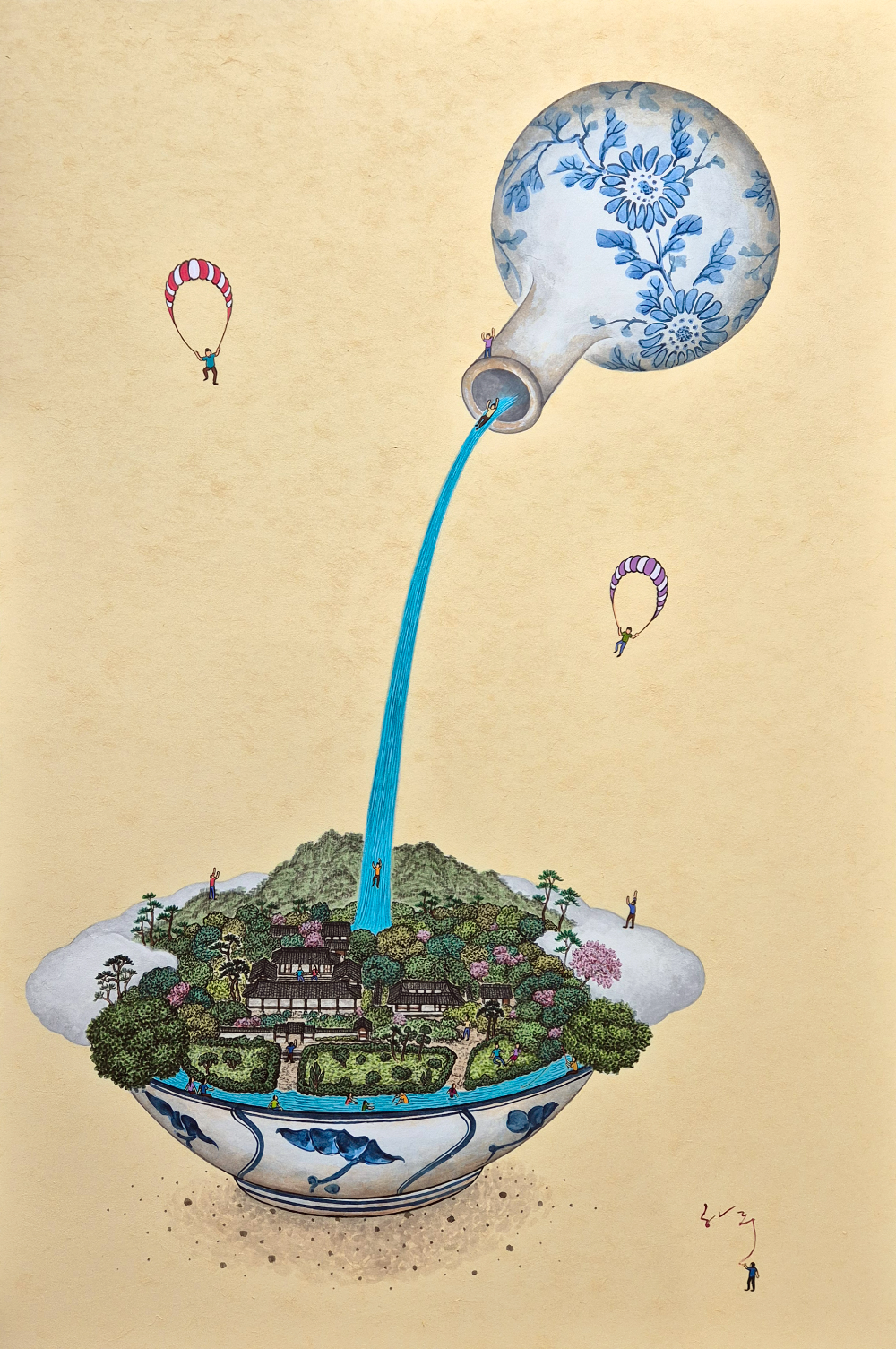 《생태의 집 – 한옥》하루.K, 짜~안(병산서원, 안동소주), 2025, 한지에 먹, 아크릴과슈, 117x91cm 참여 작가는 김도영, 김선두, 김민주, 김유정, 김준, 김홍식, 남경민, 남다현, 노치욱, 안윤모, 이윰, 하루.K 등 현대미술 작가 12인과 건축집단MA(유병안 건축가) 1팀, 총 13명(팀)으로, 회화, 설치, 사진, 사운드 아트, 미디어아트, AI 기반 영상, 건축 아카이브 등 다채로운 작품을 선보이고 있다.