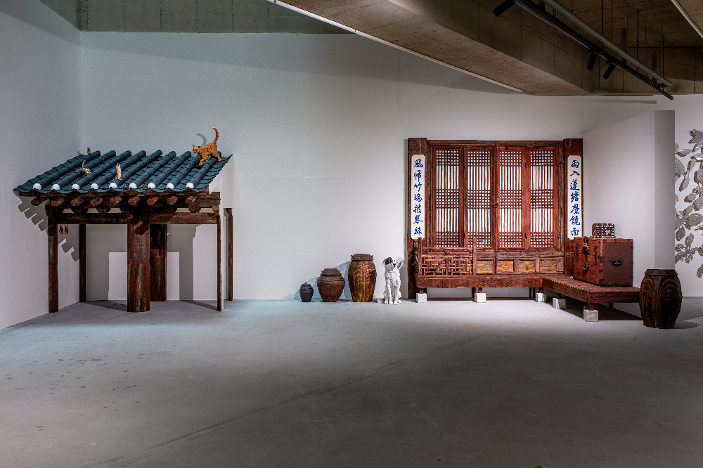 《생태의 집 – 한옥》 김유정, 흑백지대, 2025, 틸란드시아 식물, 옛 물건, 유물, 와이어, 가변크기